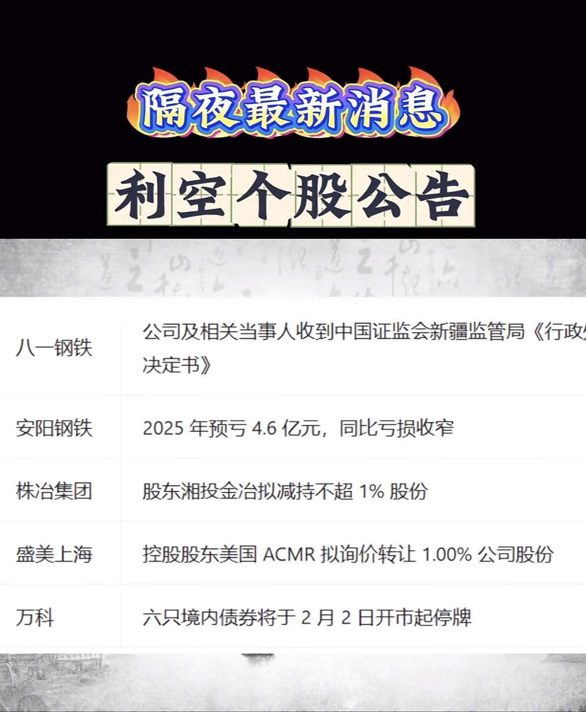 利空个股公告一览,八一钢铁、安阳钢铁等公司受影响 "多家企业年报预亏,*ST恒