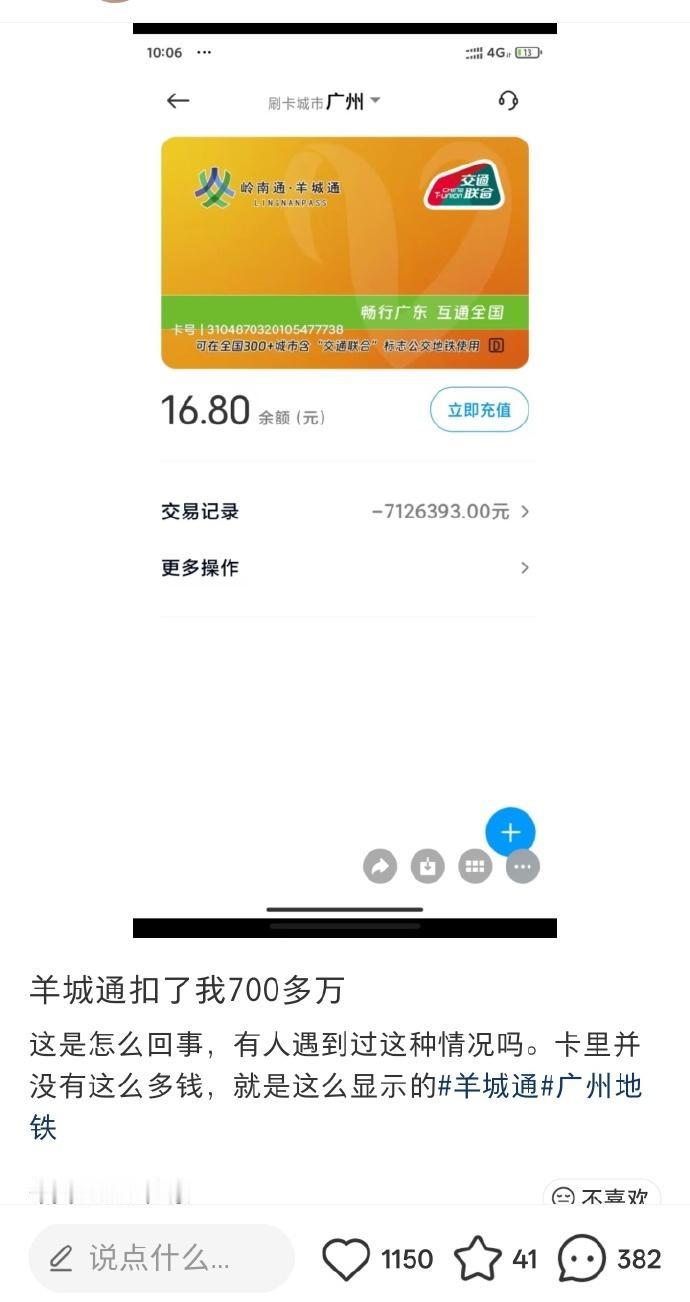 一位小红书用户的羊城通被扣了 700 万[哆啦A梦吃惊]