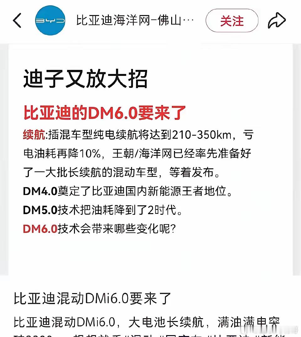 迪子又炸场!DM6.0把插混卷到友商头皮发麻迪子这次的DM6.0,直接把插混技术卷出了新次元。官方信息显示,全新插混车型纯电续航将达到210-350km,亏电油耗还能再降10%,满油满电续航更是突破2300+km。要知道,此前DM4.0奠定了比亚迪的王者地位,DM5.0把油耗压进“2时代”,这次直接把纯电续航拉到了很多纯电车型都达不到的高度。对比友商,现在多数品牌插混车型的纯电续航还停留在100-200km区间,亏电油耗普遍在4-5L/100km。当友商还在纠结“插混是不是过渡技术”时,比亚迪已经把插混做到了“比纯电还能跑、比燃油还省油”的程度。矛盾点直接摆上台面:DM6.0的技术代差,会不会让友商的插混车型瞬间沦为“前代产品”?当比亚迪把插混续航卷到350km,友商是跟进技术路线,还是转向纯电?这波操作,不仅让用户纠结,更让整个行业陷入思考。