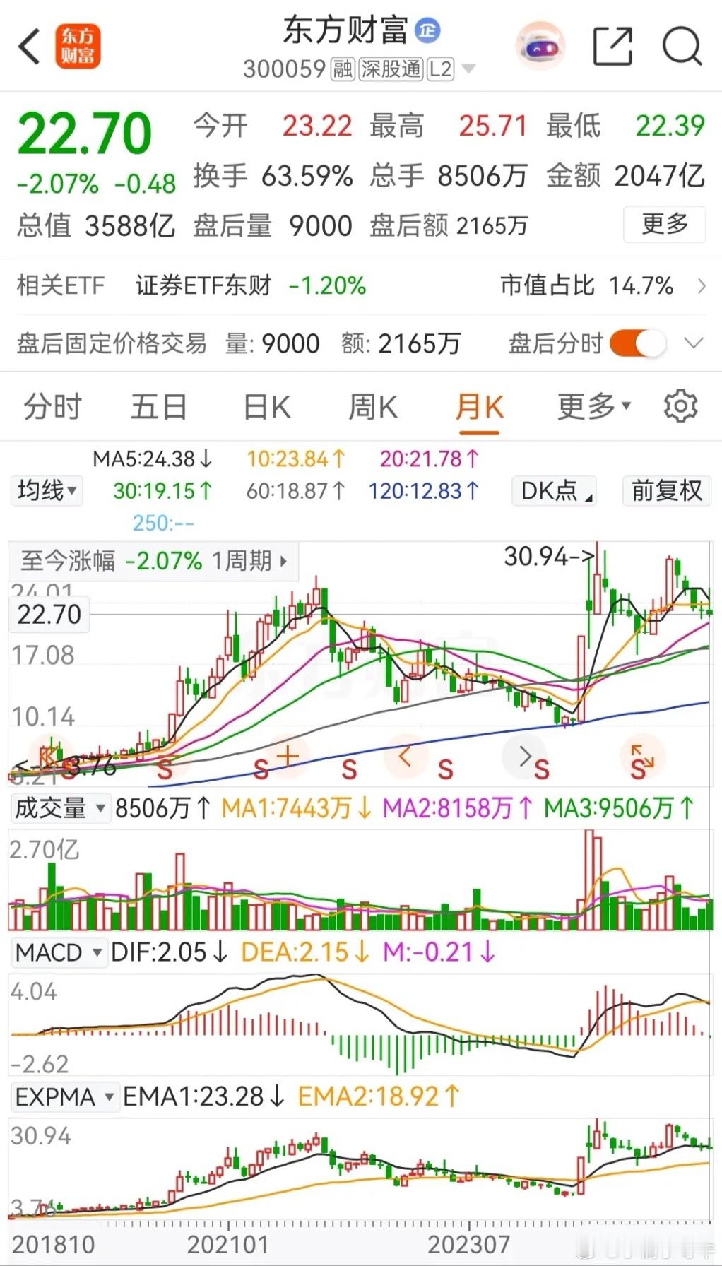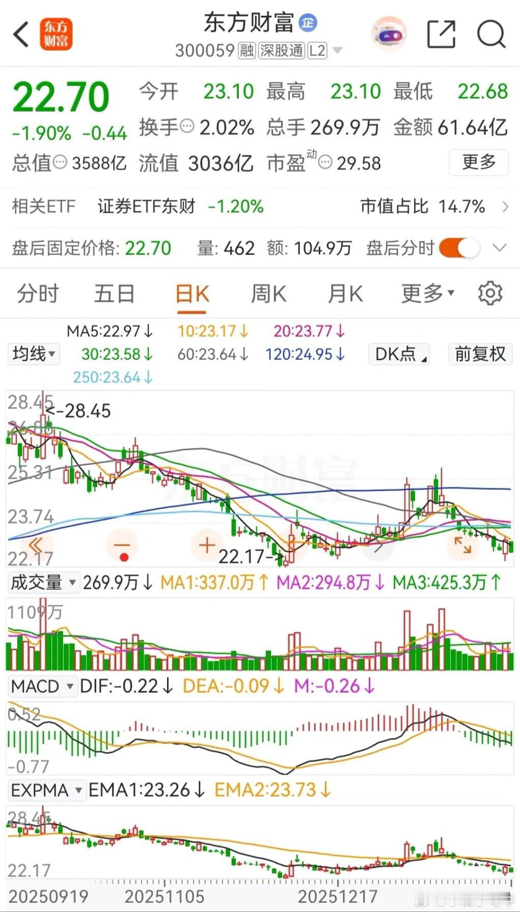 东方财富本周的走势延续了上周的下跌态势,只是周四反抽了一下,到了周五就把前一日的涨幅全部跌没了,当前的报价为22.7元,总市值为3588亿元。在资金流向上,本周五个交易日里有三天都被主力资金净卖出,本周被主力资金合计净卖出了约 16.5152亿元,周线连续三周收阴,本周的跌幅为2.58% ,而月线更是连续四个月收阴,一月的跌幅为2.07% 。从走势上看,目前依然处于破位态势之中。