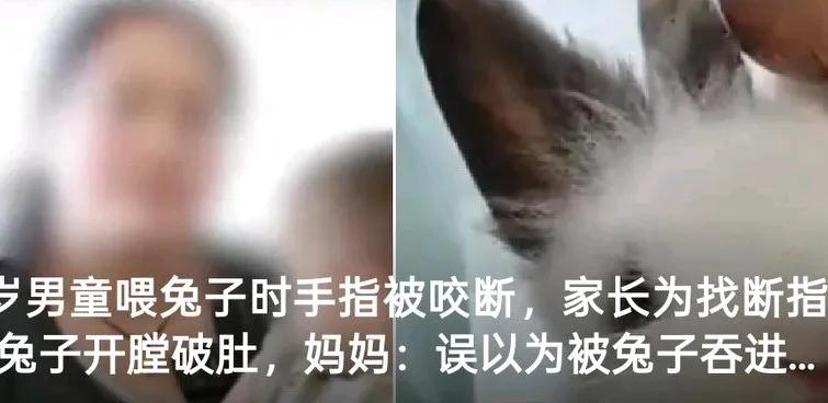 一岁男童喂兔子时,手指被咬断,家长为找断指将兔子开膛破肚,妈妈说误以为被兔子吞进了肚里, 原来是孩子在拿茄子喂兔子时哇哇大哭, 爷爷奶奶在厨房做饭, 听到哭声后赶紧跑过来, 一看孩子的指甲跟一小节手指不见了, 以为兔子把孩子的断指吞进去了, 急忙开膛破肚,却没有找到,后来在兔子笼里找到了断截半指, 目前孩子的断指已顺利接活。网友说, 兔子的门牙终身都在长, 得不停磨,越磨越锋利, 咬合力集中在很小的点上, 压力特别大。 孩子自己独自在笼子旁边,真的很危险。。