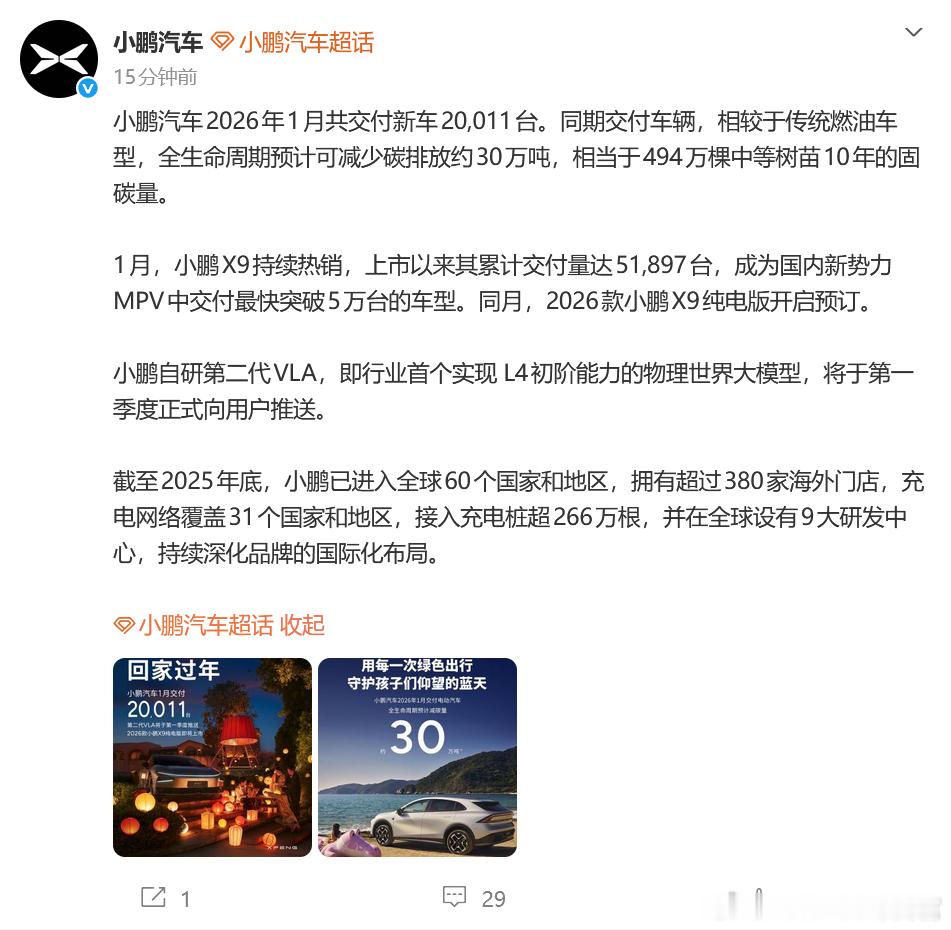 小鹏汽车1月销量20011台,看来上月上市的增程版还没开始上量