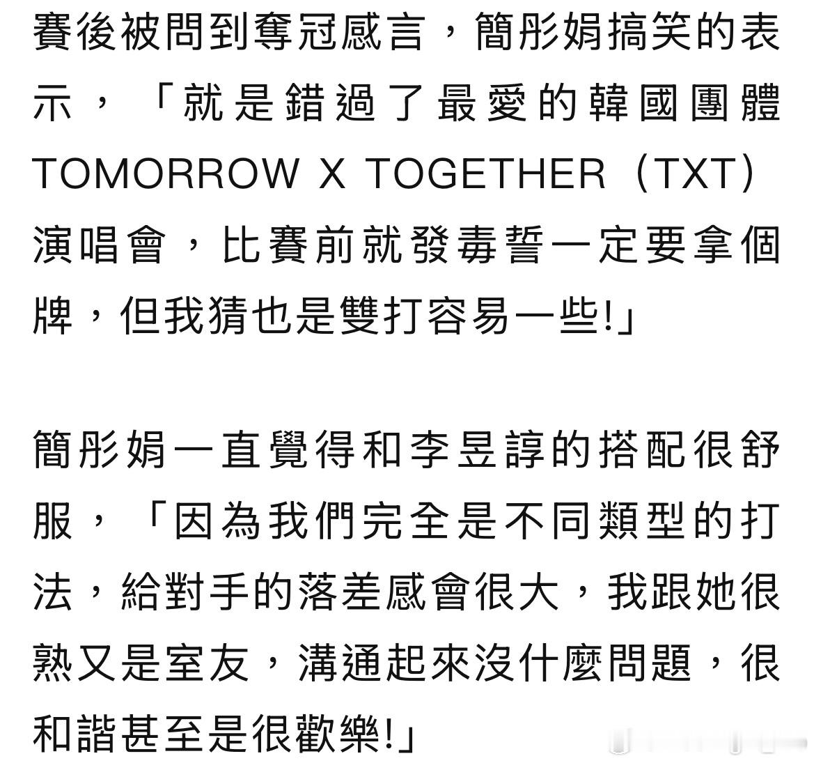 赛后被问到夺冠感言,简彤娟搞笑的表示,「就是错过了最爱的韩国团体TOMORROW X TOGETHER(TXT)演唱会,比赛前就发毒誓一定要拿个牌,但我猜也是双打容易一些!」