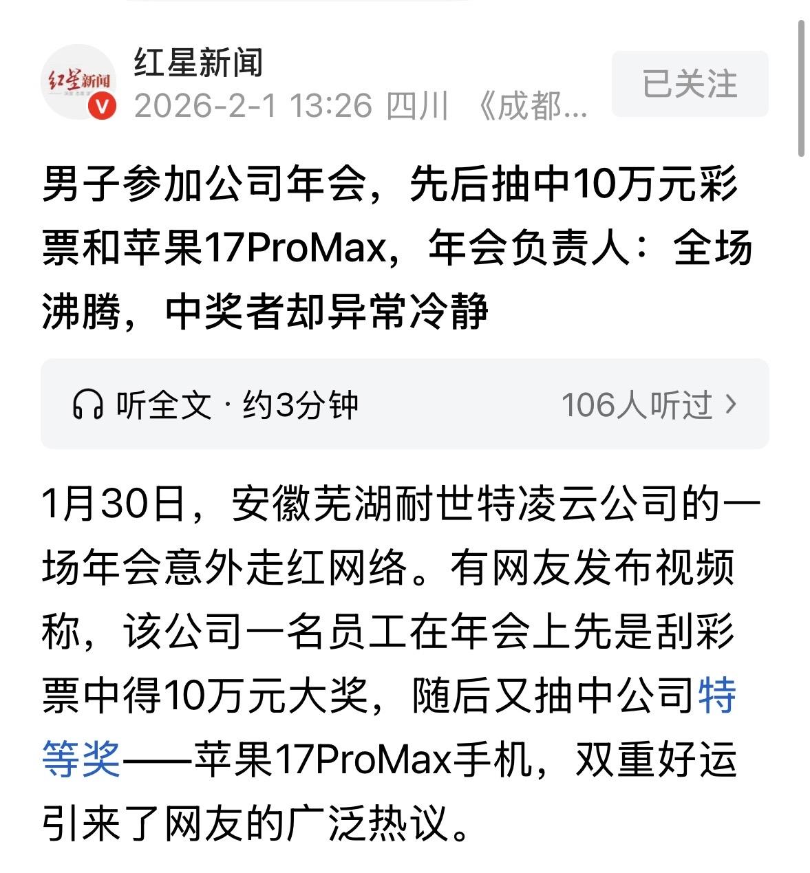 “运气来了,挡都挡不住!”安徽芜湖,男子参加公司年会抽奖,他先抽中10万彩票,转头又抽中万元苹果手机,这下全场沸腾,所有人都看傻眼,男子却云淡风轻,波澜不惊。网友:公司还招人吗? 1月30号这天,一家公司举办年会,500多号人挤在一起,现场相当热闹。 当天公司为了搞气氛,弄了一面大大的福袋墙,里面给每个参会的人都塞了一张20块钱的刮刮乐彩票。 这本来就是个助兴的小节目,大家也没指望真能中个金山银山,平时也就刮个十块二十块的图个乐。 但这运气来了,真是城墙都挡不住。 一位姓朱的老员工,平时在车间里踏踏实实干活,话不多,属于扔进人堆里找不着的那种。 他随手撕开彩票涂层,这一刮,再一对数字,竟中了10万块! 朱先生当时就懵了,拿着彩票的手都有点哆嗦,不敢相信自己的眼睛。 赶紧把旁边的年会负责人胡先生拉过来,说胡总,你快帮我瞅瞅,这是不是真的? 胡先生也替他高兴,让他有空了抓紧去彩票站核验。 后来朱先生去兑奖,扣掉2万的税,8万块现金实打实进了口袋。 如果故事到这就结束,那已经是运气爆棚了。但接下来的剧情,连电视剧编剧都不敢这么写。 到了抽特等奖的环节,奖品是两台最新的苹果17 Pro Max手机,价值1万多呢。 总经理看着刚中了大奖的朱先生,寻思这小伙子今天运气这么旺?干脆借借他的手气! 于是,总经理特意把朱先生请上台,让他来当这个抽奖嘉宾。 朱先生站在台上,手里握着抽奖箱,估计心里也在犯合计,刚中了钱,还能再中手机?这概率得多低啊? 可命运就是这么奇妙,他随手一摸,抽出来的名字,竟然是他自己! 这下,全场瞬间沸腾了。刚才是中奖,现在是自抽自中,这是什么神仙操作? 台下的同事们有的拍大腿,有的尖叫,还有的喊着“这不科学”。 但朱先生本人呢,跟刚才中10万块时一样,脸上没啥大波澜,淡淡定定的,好像这事儿跟他没关系似的。 事后胡先生接受采访时也乐得合不拢嘴,他说公司搞年会向来舍得花钱,光奖品就准备了20万的预算,像大疆相机、电动车这些都是实打实的硬货。 之所以让朱先生上台抽奖,纯粹是觉得他运气好,想让他把这份好运传递给大家,绝对没有任何暗箱操作或者内定的说法。 胡先生对朱先生印象很深,觉得他最大的特点就是稳,说这小伙子在公司干了好多年了,就是个普普通通的一线员工,老实巴交的。 一般人中个奖早就跳起来了,他倒好,跟没事儿人一样,这心理素质,真不是一般人能比的。 这段视频传到网上后,网友们瞬间不淡定了。有人算了一笔账:刮刮乐中10万的概率大概是几百万分之一,抽奖再中自己的概率是几百分之一,这两个加在一起,简直是“欧皇”本皇。 还有网友调侃,这公司还招人吗?我要去上班! 当然,也有少数声音质疑是不是公司为了宣传搞的剧本。但黄先生作为现场的摄影师,他的镜头记录了最真实的反应。 朱先生中彩票时的错愕,和抽奖时的茫然,那种下意识的微表情是演不出来的。 对于大家来说,这事儿除了羡慕,其实也能看出点别的门道。这家公司虽然是搞技术的,但在对待员工上确实挺大方。 一年一次的年会,500多人的场子,说砸钱就砸钱,这种舍得劲儿,也难怪员工能踏踏实实干很多年。 现在的朱先生,手里拿着8万块现金和一部新手机,估计回家路上还在琢磨这事儿是不是做梦。 对于朱先生来说,这可能是他职业生涯里最魔幻的一天。 对于我们这些围观群众来说,除了吸一口欧气,也就只能默默祝福这位天选打工人,以后的日子能像这晚的运气一样,红红火火吧! 对此,你怎么看? 关注@运良说法