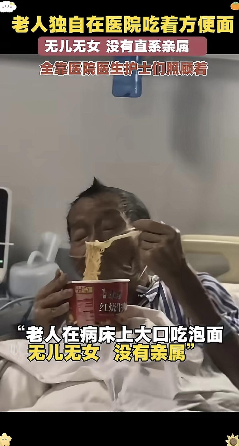 一张照片让很多人看了揪心:医院病床上,一位白发老人正大口吃着泡面。更让人难过的是,老人没有儿女,身边也没有其他亲人陪伴。 这张照片之所以触动人心,是因为它撕开了许多老年人,特别是“无儿无女”的独居或孤寡老人,在面临病痛与衰老时最现实、也最无助的一面。当最基本的照护与陪伴成为一种奢望,一桶简单的泡面便成了生活的缩影。