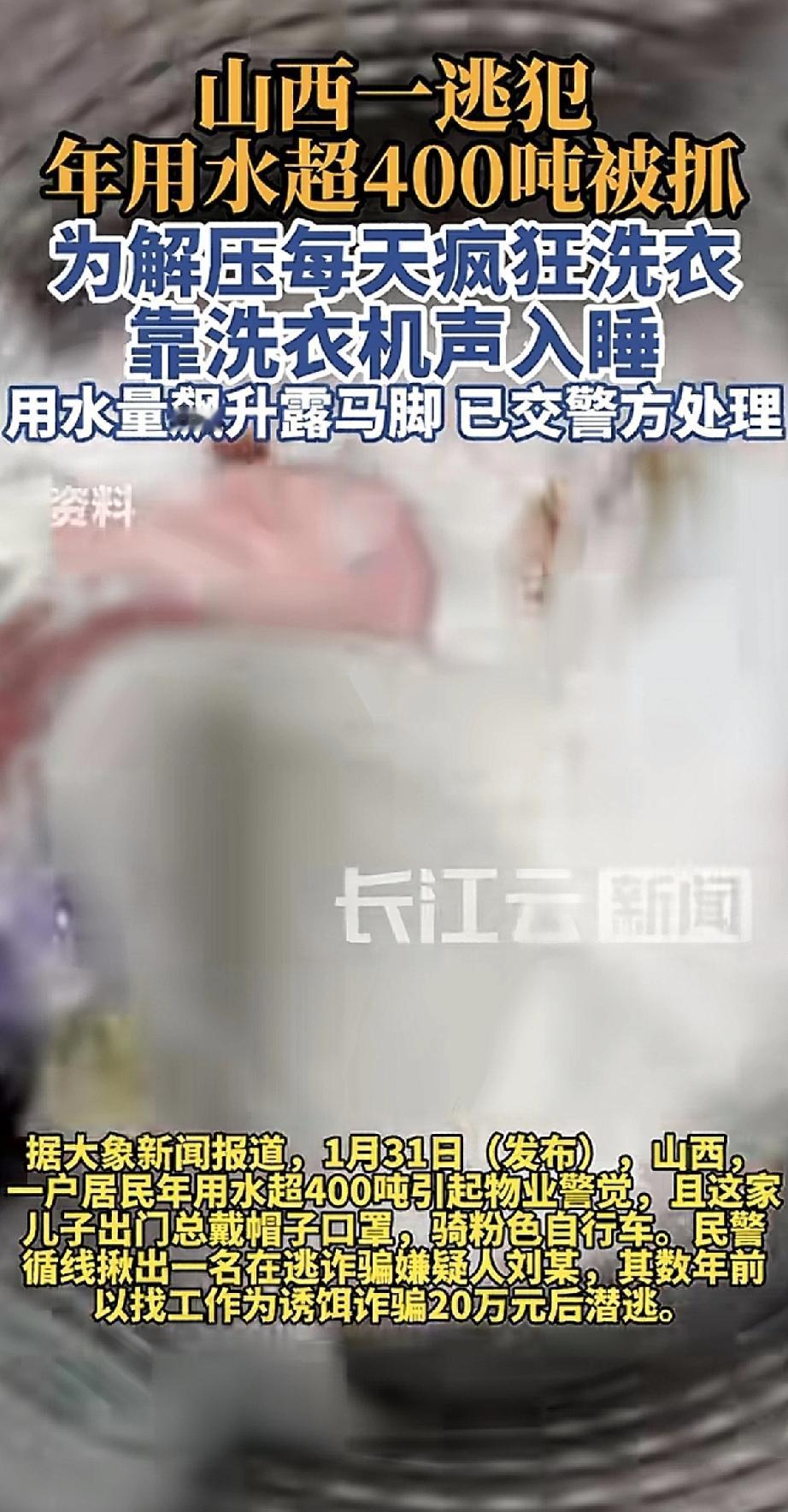 真是头一回见,有人因为用水太多把自己给“洗”进去了。 山西这边,物业发现一户居民家一年的用水量竟然超过了400吨,比正常家庭多好几倍,觉得特别不对劲。再一观察,这家儿子出门总是帽子口罩捂得严严实实,还骑辆粉色自行车,行为古怪。民警一查,果然揪出一名诈骗20万元的在逃嫌疑人刘某。 原来,这人潜逃后心理压力巨大,为了解压,居然养成了每天疯狂用洗衣机洗衣服的习惯,甚至要靠洗衣机的轰鸣声才能睡着。没想到,正是这异于常人的“解压方式”让用水量飙升,意外暴露了行踪。 这大概就是“法网恢恢,疏而不漏”的现代版吧——生活里任何不寻常的细节,都可能成为线索。