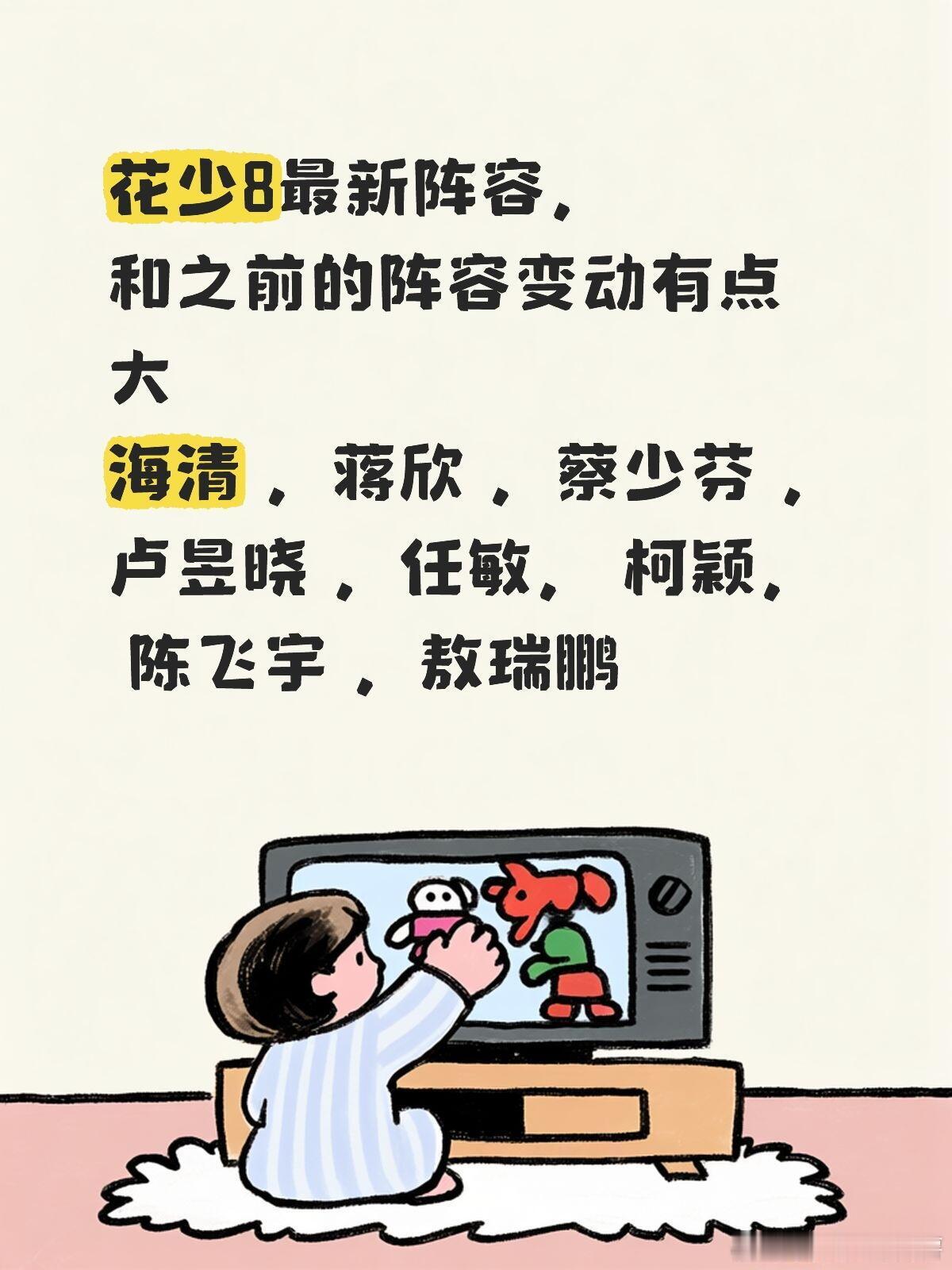 这个靠谱么?花少8最新阵容,和之前的阵容变动有点大海清 ,蒋欣 ,蔡少芬 ,卢昱晓 ,任敏, 柯颖, 陈飞宇 ,敖瑞鹏