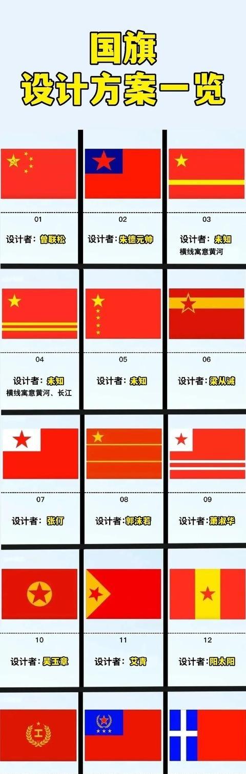 朱德设计的国旗:没选上,郭沫若设计的国旗:没选上,在选国旗这件事上,并不是说谁的名气大,谁设计出的国旗就最有权威性。 1949年夏天,新政协筹备会开了会,分了六个小组,第六组管国旗国歌国徽。从7月14日到8月15日,好几家报纸登了征集启事,全国上下寄来三千多幅图案稿。小组合专家一张张审,觉得红色底最合适,五角星当主角。 有些稿子上排五颗星,有些加黄杠代表黄河长江。经过几轮挑,选出一批转给代表们。周恩来定规矩,图案编册子只标号不写名字,朱德的稿子是红底左上蓝矩形里红星,郭沫若的是红底一星两条黄杠,全都匿名。 9月23日代表分组讨论,投票时带黄杠的复三号拿了185票,复四号129票,五星才15票。张治中说黄杠像把中国分成两半,不利于统一。新国家刚建,最忌讳分裂暗示,五星红旗红底整块,五星聚拢,没那问题。 两天后讨论转到五星上,大星代表领导,小星代表工人农民小资产阶级民族资产阶级,体现革命团结。朱德的蓝块和郭沫若的黄杠虽有想法,但视觉上不稳。 9月27日全会通过,五星红旗定案。曾联松的设计本来大星里有锤镰,后来去掉,更简洁。 国旗选拔这事儿,从头到尾都讲究公平,征集稿匿名审,投票看图案本身。朱德的设计用蓝矩形想表蓝天革命,但颜色分块,整体不协调。郭沫若加黄杠想象征河流,创意不错,可横杠位置容易误会成割裂国土,尤其当时强调大团结。 五星方案出自曾联松,他那时在上海做经济事,看到报纸启事就画了好几稿,用尺量比例调位置,寄出去后也没多想。图案初选差点落榜,后来田汉主张才进复选,去锤镰后更庄严。相比名人稿。 新中国国家形象就这样定下来,图形语言用齿轮麦穗五角星,影响设计界好多年。曾联松后来收到五百元旧币酬劳和国庆请柬,1950年去天安门看升旗,继续低调工作。 曾联松的方案从三千稿中杀出,靠的是寓意准,红底五星简洁有力。大星和小星排列,代表共产党领导下各阶级联盟,这套逻辑在讨论中反复强调,避免了黄杠的歧义。
