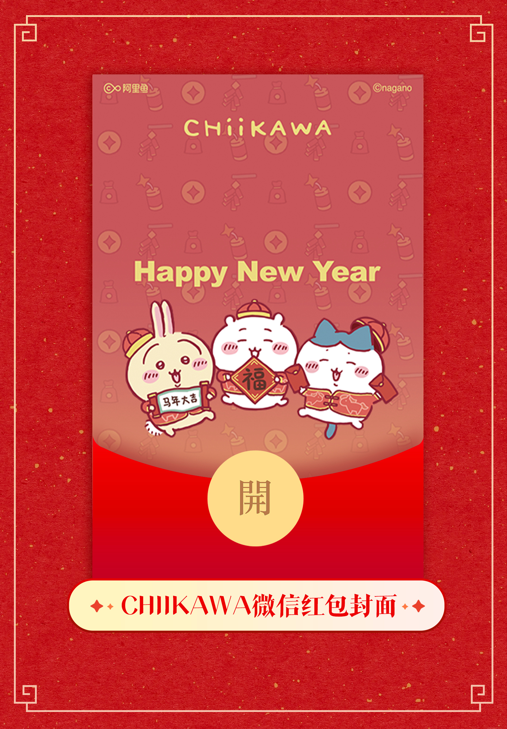 领取方式:前往【阿里鱼Alifish】公众号,在公众号内发送对应IP红包封面名称,如【CHIIKAWA微信红包封面】,即可通过自动回复中的链接进入红包封面的领取活动。chiikawa