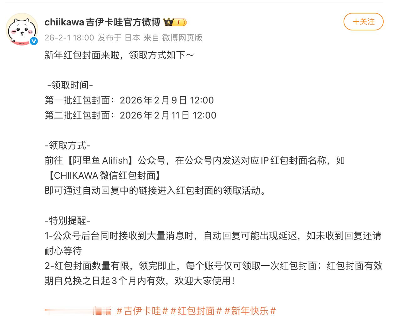 Chiikawa官微宣布其新年红包封面将分为两批领取,第一批时间为2月9日(周一)中午12:00,第二批为2月11日(周三)中午12:00,数量有限领完即止。
