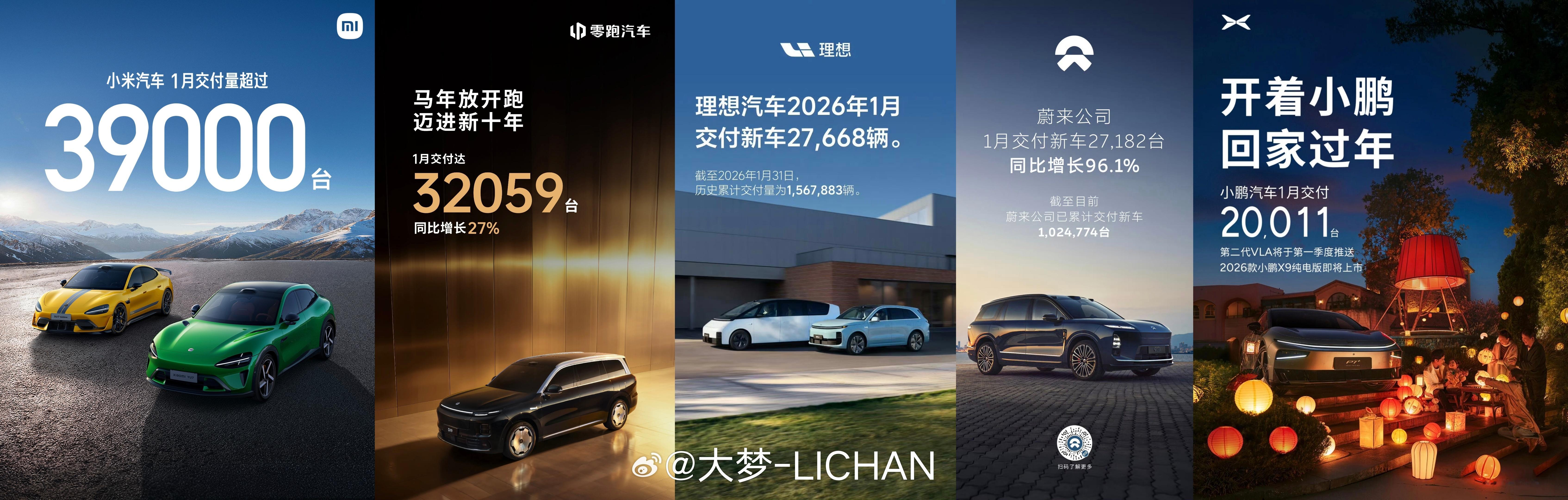 蔚来:48135→27182理想:44246→27668小鹏:37508→20011小米:50212→39000零跑:60423→32059