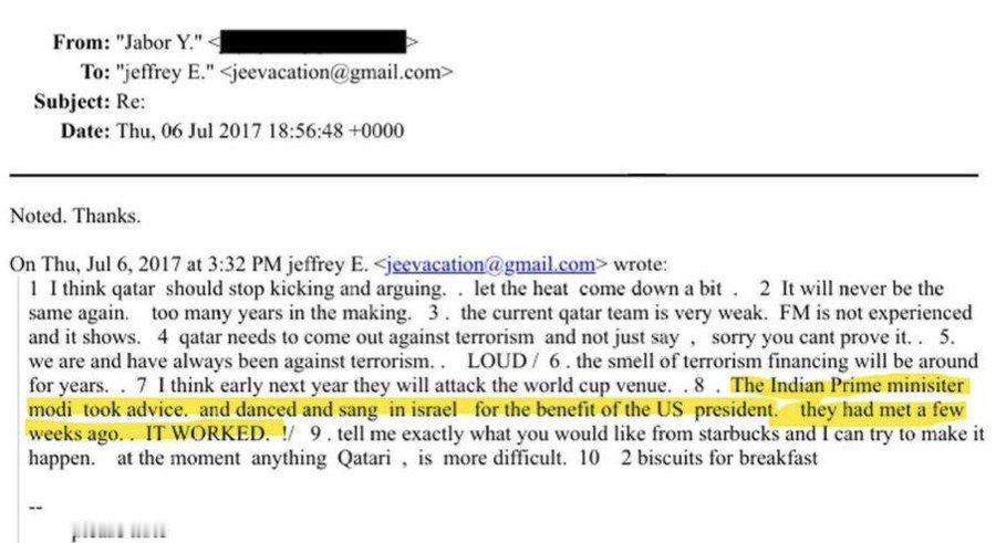莫迪总理于2017年7月4日至6日访问以色列。爱泼斯坦在三天后写下了这封电子邮件。