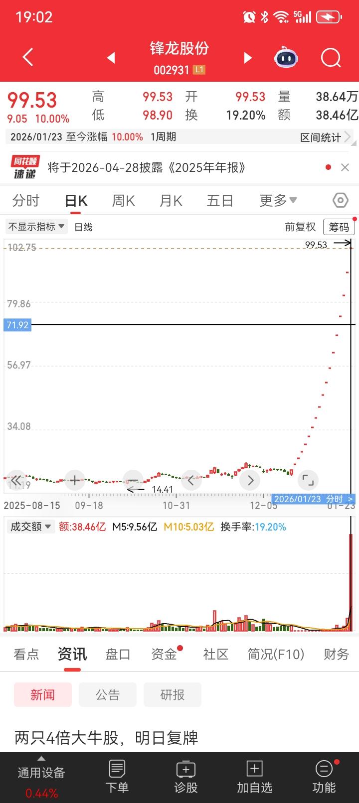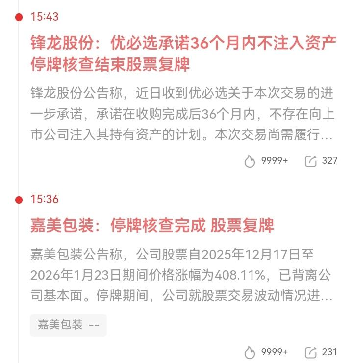 锋龙股份复牌,嘉美包装复牌,会被核按钮吗? 两大妖股核查完成周一复牌,公告内容还是老一套,大家不看都知道。明天股价走势如何,会有很多人关注。 1月26日,证券日报发文《拒绝题材炒作筑牢资本市场理性根基》。内容并非针对所有题材炒作,而是剑指无基本面支撑,股价严重脱离公司真实价值的炒作。这篇文章给市场投机情绪泼了一盆冷水! 锋龙股份,在1月23号周五,成交额38.46亿,换手率19.2%,属于放量换手板。第一波吃独食一字板的人,已经安全的拿到利润了,潇洒离场,刚进来的资金瑟瑟发抖呀。 最不愿意看到的情况,就是跌停板了。根据最近妖股杀跌的规律看,基本都是三到五个地板。也就意味着,高点买的人要亏30%到50%了。 当然参与的人是知道有风险的,只是谁接最后一棒的问题。公司公告也多次提示,未来可能出现快速下跌的风险。 嘉美包装,在1月23号大涨8.52%,股价和量能都处在历史高位,同样风险很大。 两大妖股顶风上涨的可能性很小,主力最好能稳住股价,不要以极端的方式杀跌,是比较理想的走势。