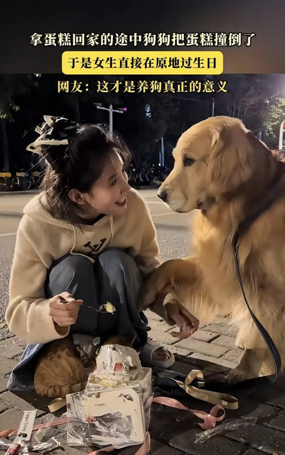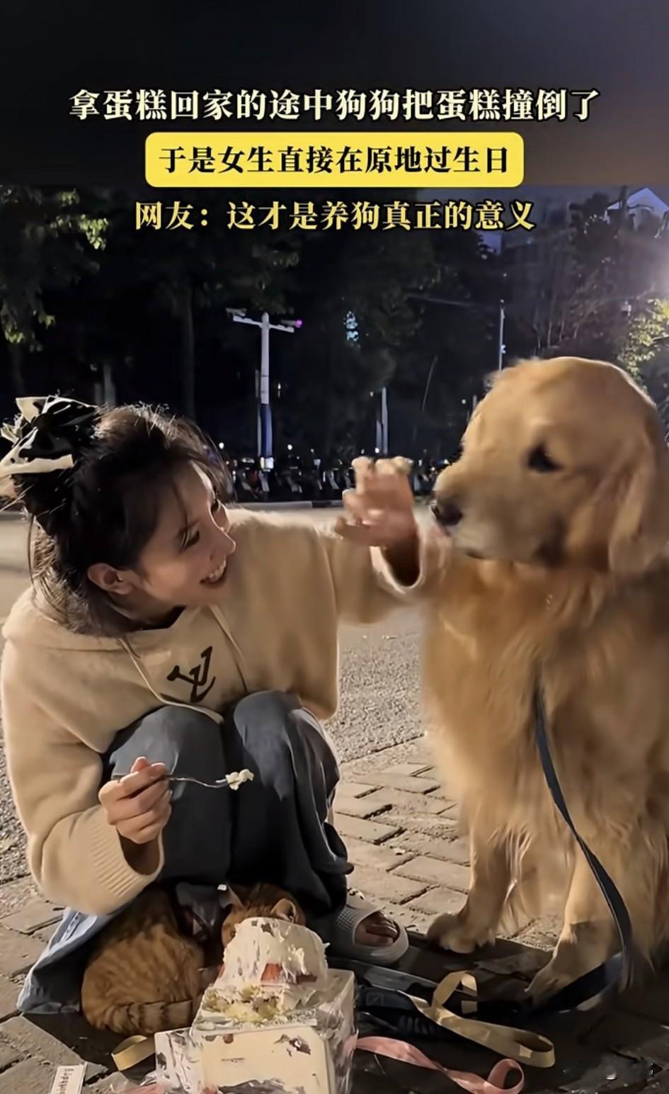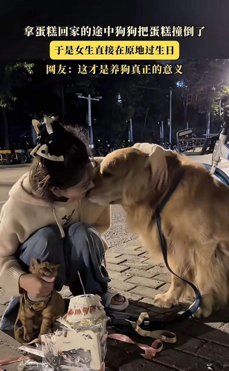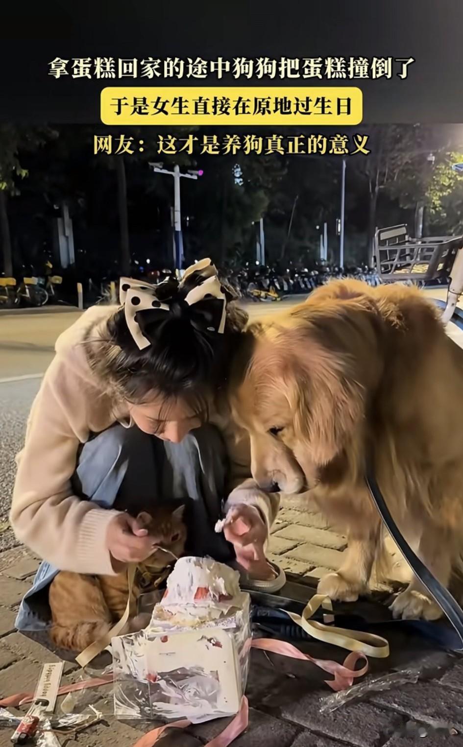 好幸福啊!一位小姐姐养了一只狗狗和一只小猫,平时就特别疼爱它们,这天是小姐姐的生日,她开开心心的带着狗狗和小猫去拿蛋糕,准备带回去一起过生日。 可在路上,狗狗不小心把蛋糕撞到了,狗狗当时就吓得瑟瑟发抖,小姐姐非但没有怪罪它,还直接就在原地过起了生日,期间还开心的点蜡烛吹蜡烛,把蛋糕涂在狗狗的脸上,之后她吃一口蛋糕,又喂一口给狗狗吃。这一幕非常的温馨,这才是养狗的意义啊!