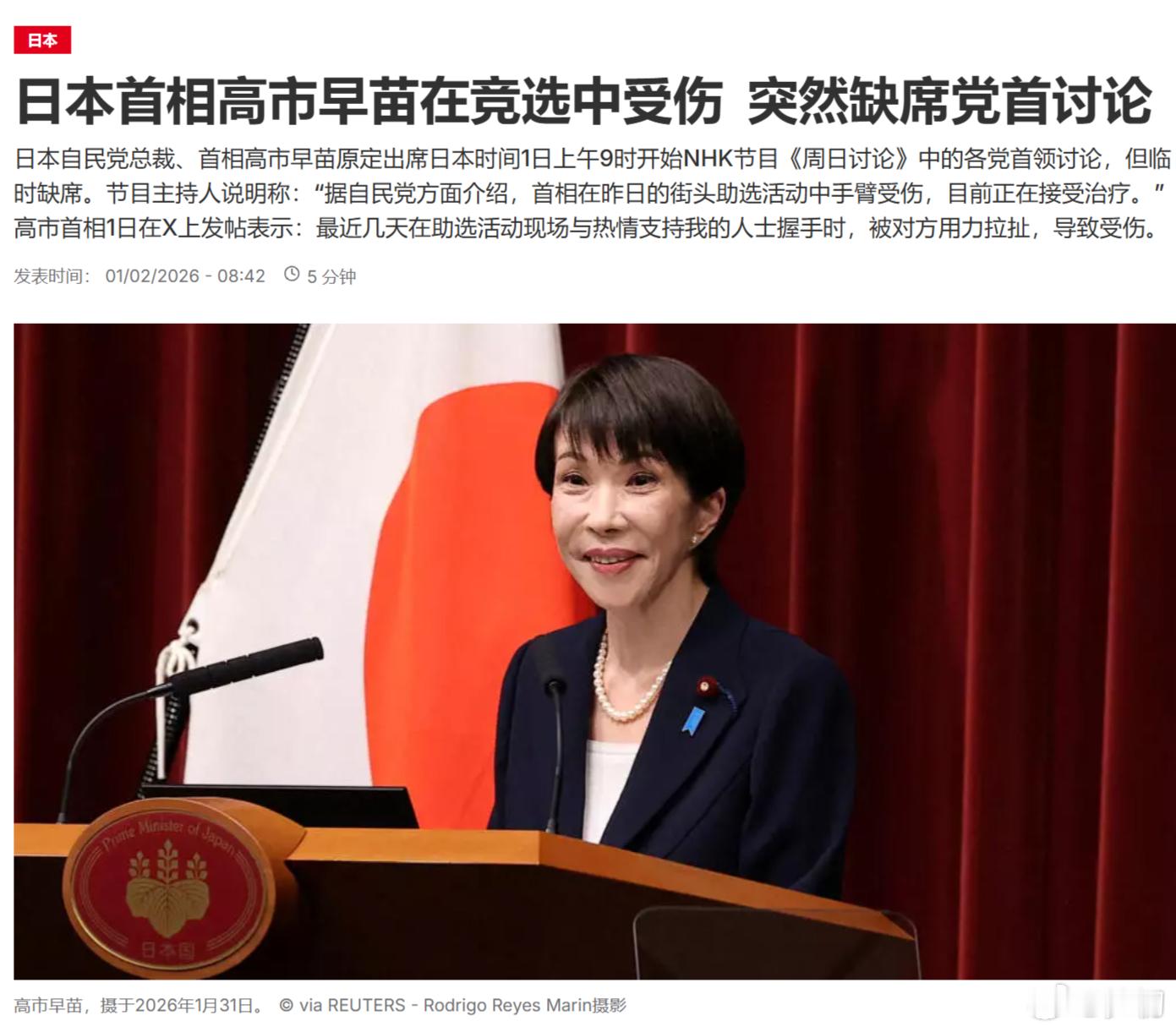 路透社:日本首相高市早苗在竞选中受伤,突然缺席党首讨论。再来个枪击案,跟陈水扁就有一拼了。