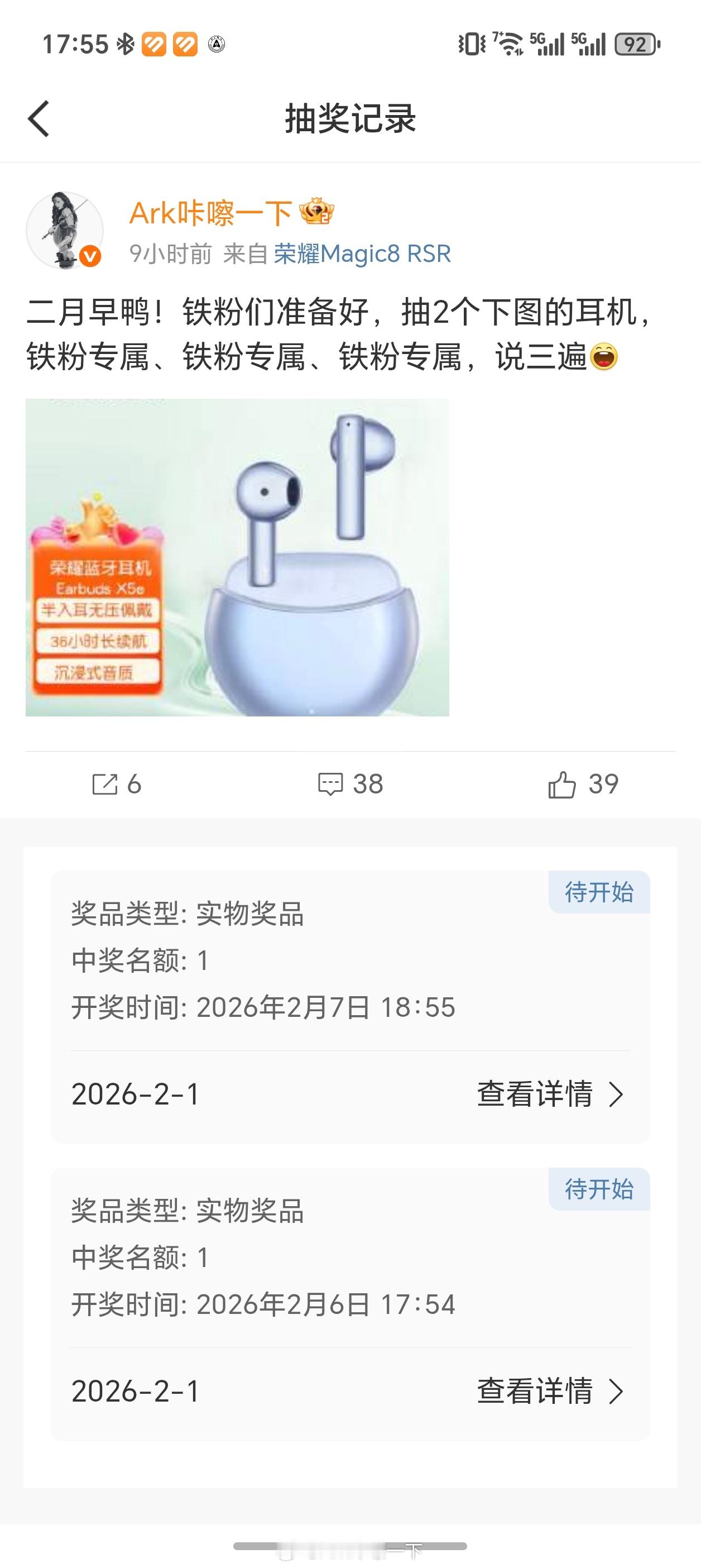 早上这条铁粉抽奖微博规则如下:转发抽铁粉以上送一个荣耀亲选耳机,评论抽一个金粉以上送荣耀亲选耳机,为了让更多人有机会,所以特预留一周时间,如果你还不是铁粉,微博连续互动三天即可,每个月保持,每个月有奖,大奖更在春节期间网页链接