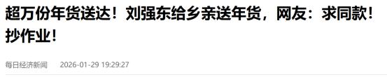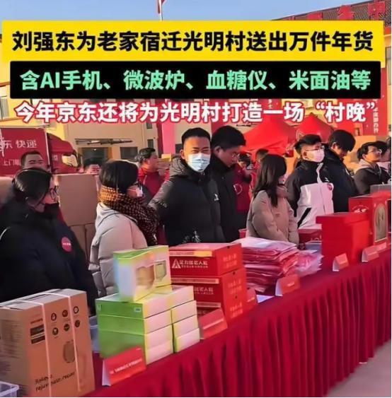 从未忘本!2026年1月29日,超万份年货送达!刘强东十几年如一日,过年必给老家乡亲送年货! 1992年的时候,刘强东以江苏省宿迁市状元的身份考入了中国人民大学社会学专业。但是那个时候刘强东的家境非常贫寒,于是村民们自发为他筹集了500元以及76个鸡蛋。 刘强东带着村民们的这些爱心,前往了北京求学。之后一路创业,取得了现如今的成就。这一路走来,刘强东从未忘记,正是村民的那份支持,才能有了现如今的他。 所以有了能力之后,他便开始回馈乡里乡亲。从2015年开始,连续12年的时间,每年过年的时候,他都会为村民们送去年货。 就在2026年1月29日的时候,又有超万份的年货,抵达了江苏宿迁光明村。今年的年货非常丰富,不仅有米面,粮油等一些基础的生活物资,还有能够识别方言的AI手机,能够语音控制的电热毯等。 刘强东把自己对乡亲们的感恩,汇入了一份又一份的年货礼品中。刘强东的成功令人为之羡慕,而刘强东十几年如1日,过年必给老家乡亲送年货的行为,更是令人为之动容。 从刘强东的身上,看到了真正的衣锦还乡。而除了给村民们发年货礼品之外,刘强东还会给村里的老人发现金红包。作为亿万富翁的刘强东,除了给村里人每年送年货之外,他还会每年抽出一天的时间,亲自去为客户送货。 出生平凡的他,深知底层老百姓生活的不易。所以他也一直在自己的能力范围内,去让更多的人把日子过好。 对此,您怎么看?欢迎评论区留言您的看法,我们一起讨论一下。 (信息来源:超万份年货送达!刘强东给乡亲送年货,网友:求同款!抄作业!-每日经济新闻)
