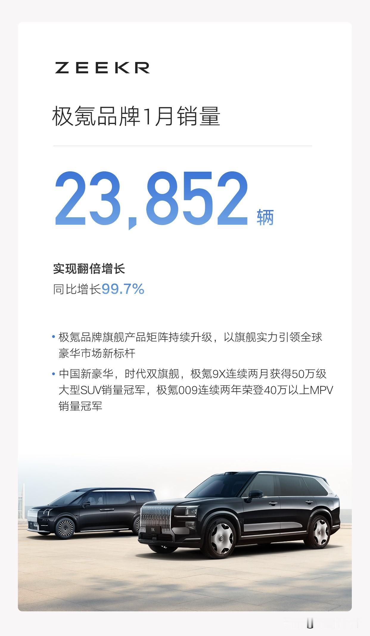 “一个吉利”聚势向上!吉利汽车1月销量270167辆,同环比双增长,新能源销量12.4万辆,海外出口销量同比翻倍增长。具体来看: 吉利中国星1月销售134448辆,吉利银河品牌1月销量82990辆,领克品牌1月销量28877辆,极氪品牌1月销量23852辆,1月海外出口销量60506辆。 吉利汽车现在销量走的很稳,而且是高质量![赞]