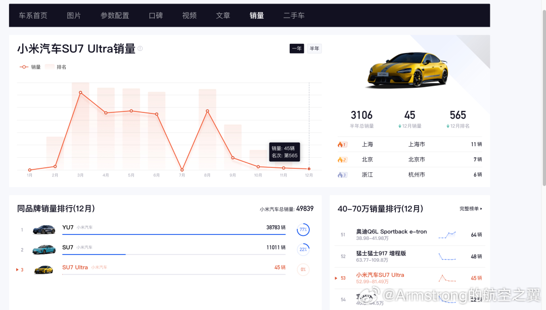 小米SU7 Ultra自上市以来经历过明显的“过山车”式波动,2025年上半年表现强劲,3月曾达到 3101辆 的峰值。从2025年9月开始出现断崖式下跌,9月销量为488辆,11月跌至不足百辆,直至12月触底。