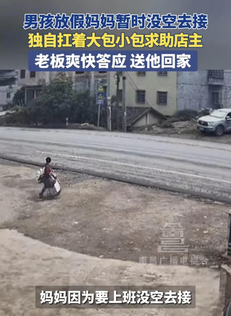 广西钦州一男孩放假之后,因为妈妈上班没空来接,自己之后扛着大包小包的行李走在路上,经过一家店铺的时候,男孩大胆的求助于老板,能不能开车送他回家,没想到老板爽快的答应了。虽然离家只有一两公里的距离,但是老板的举动却温暖了孩子的整个假期。很多网友说,哪怕老板不答应,但男孩能够勇敢的开口,这也算是生活的一节很重要的实践课。