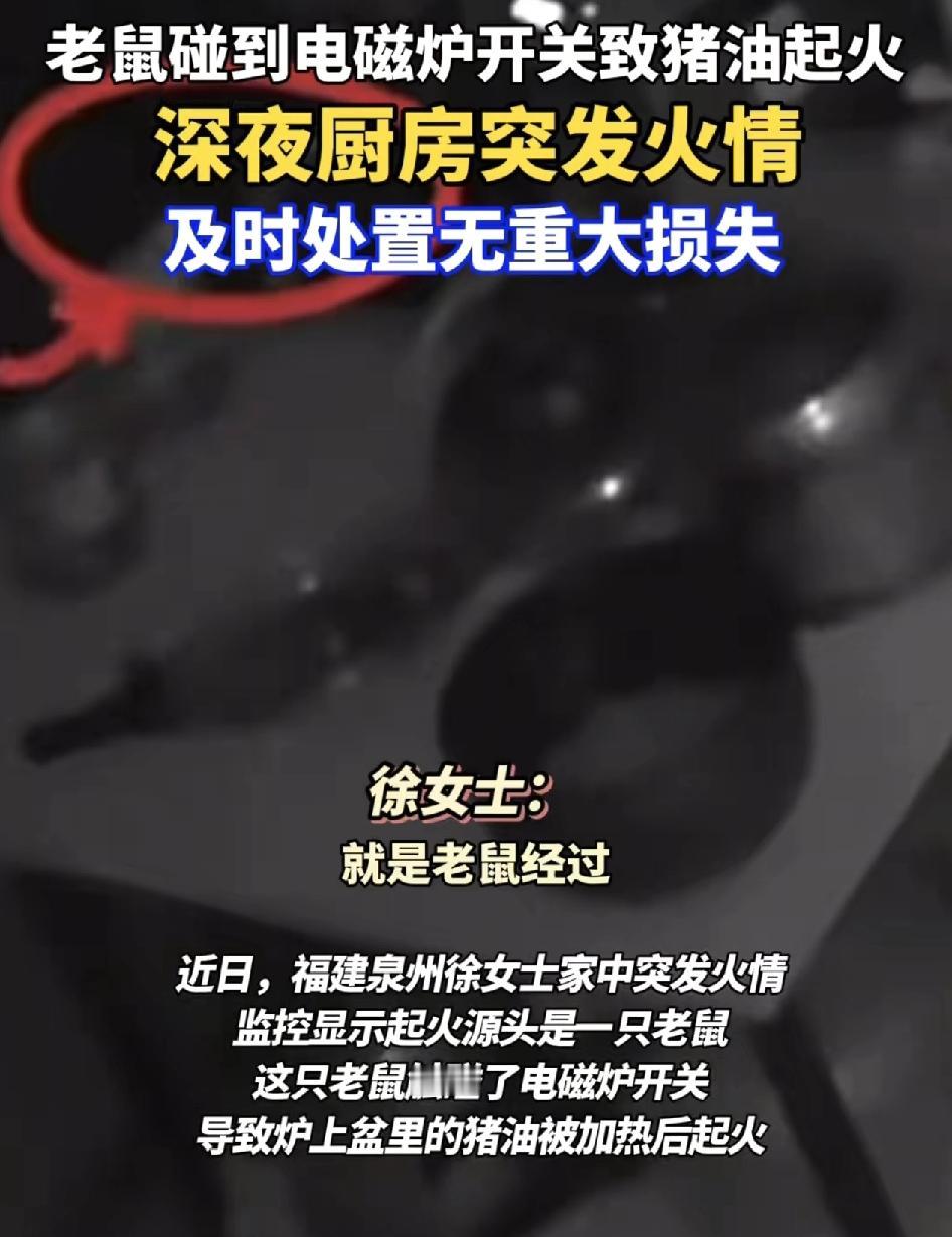 福建泉州一位网友称,家里厨房一只老鼠经过时误碰了电磁炉的开关,导致电磁炉上的一盆猪油。被加热起火,幸亏是当时孩子回家发现了火情,并及时做了处置,没有引发更大的财财产损失和人员受伤。这事情也告诉我们,厨房里炉灶旁边不要放一些易燃易爆的物品,同时使完使用完电器一定要及时的断电。
