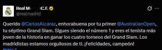 阿尔卡拉斯生涯首夺澳网冠军,成为史上最年轻的全满贯球员。皇马官方也为他送上了祝福,皇马官方写道:“亲爱的阿尔卡拉斯,祝贺你赢得首个澳网冠军,这也是你第七个大满贯冠军!你依然稳居世界第一,并且成为历史上最年轻的全满贯球员,我们皇马的球迷为你感到骄傲!祝贺你!冠军!”皇马祝贺阿尔卡拉斯澳网夺冠阿尔卡拉斯最年轻全满贯澳网