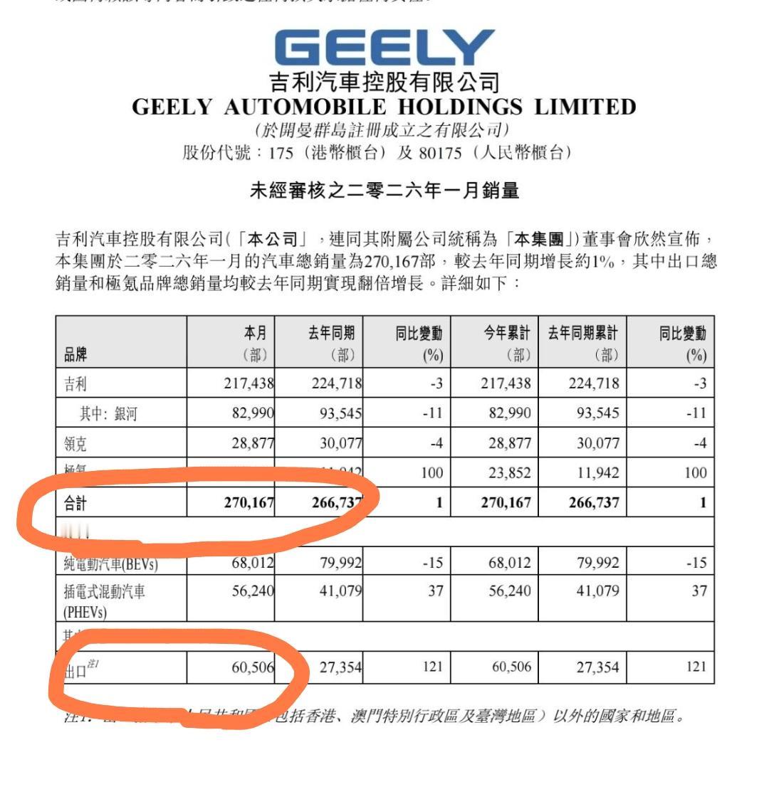 一月份销量出炉了,比亚迪1月销量21万台,同比减少30.11%,其中出口10万台,国内销量11万台。 吉利1月销量27万台,同比环比双增长,出口6万台,国内销量21万台。 可怕的是吉利国内销量几乎是迪子的两倍了,吉利这么猛吗? 大家怎么看?