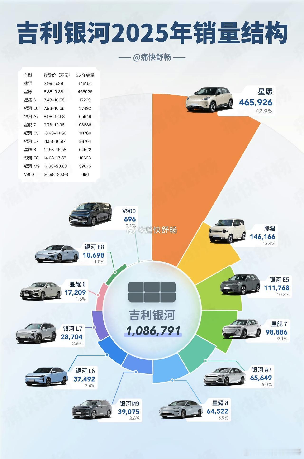 吉利银河系列具体车型销量出炉!!!吉利银河系2025年全年销量109万,其中星愿销售46.6万辆,占比42.9%,熊猫销售14.6万,占比13.4%,银河E5销售11.2万辆,占比9.1%……银河星愿销量确实可以,整体销量跟比亚迪的海鸥旗鼓相当,凭借着更大的空间,更靓丽的外观,硬生生从比亚迪嘴里分了一块肉,有竞争是好事,对买车的大众花更少的钱买到更好的车……