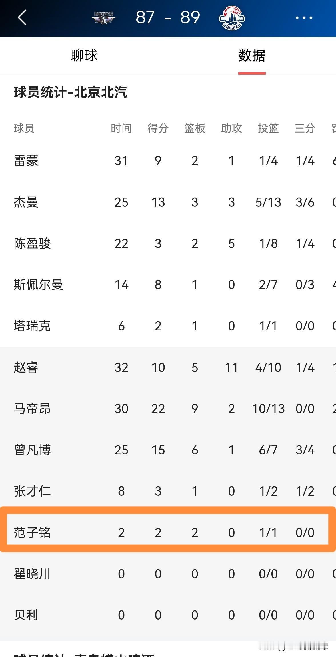 北京北汽大将范子铭真是太屈才了!在今天北京北汽主场以87:89输给青岛崂山啤酒的比赛中,范子铭仅仅替补出战2分钟就惨遭主帅许利民的弃用,完全没有机会展现自己的能力。 整场比赛下来,范子铭替补出战2分钟,投篮1中1得到2分2篮板,没有出现失误和犯规。 实事求是的说,虽然范子铭的进攻能力比较一般,但是他在防守端和拼抢篮板方面还是非常不错的,因此许利民教练仅仅给范子铭两分钟的上场时间,完全没有发挥出范子铭的能力。