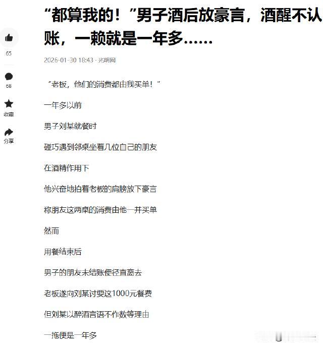 虚言豪语空承诺,失信赖账惹纷争!湖北大冶,一男子去餐馆用餐,碰巧邻桌坐着几个朋友。酒过三巡,他借着酒劲,手指朋友那桌,豪气地向老板放话,称这桌饭钱他来结。朋友听闻,真就放开吃喝,消费了1000元后,没结账便离开了。老板找男子要钱,男子酒醒后却翻脸不认,称自己只是客气客气,不当这冤大头,让老板找吃饭的人去要钱。 这事,得从一年前说起,刘某这人平时就爱吹牛,那天他晃晃悠悠走进餐馆,一眼就瞅见邻桌几个朋友正吃得热火朝天。 他这人,一喝上酒就爱显摆,三杯下肚,脑子一热,扯着嗓子就冲老板喊,那桌饭钱他付。 老板当时正忙活着,听刘某这么一说,也没多想,就应了声好。 邻桌那几个朋友一听,乐了,本来还担心这顿饭钱呢,这下好了,有人买单,那还客气啥,敞开了吃喝。 酒菜一样样往上端,几个人吃得那叫一个畅快,最后算下来,1000元。 吃饱喝足,几个人拍拍屁股就走人了,压根没提结账这茬。 老板娘在柜台后头看着,想着刘某都承诺了,也就没拦着。 等刘某酒醒,老板娘过来找他结账,他倒好,瞪大了眼睛,一脸无辜,说啥自己只是客气客气,不当这冤大头,让老板娘找吃饭的人要去。 老板娘一听,气坏了,这1000元可不是小数目,扣除成本,得卖好几桌菜才挣得回来。 她跟刘某理论,可刘某就是死不认账,还骂老板娘贪心,说啥自己又没签合同,凭啥给钱。 老板娘气得直跺脚,可也没办法,只能自认倒霉,这事就这么搁下了。 可老板娘心里憋屈,这1000元,对小本生意来说,可不是个小数目。 她天天念叨着这事,心里头那个恨,恨刘某不讲信用,恨自己当初没留个心眼。 一年过去了,刘某可能早把这事给忘了,可老板娘没忘。 这天,刘某又晃晃悠悠走进了餐馆,老板娘一眼就认出了他。 她蹭一下就上来了,走过去,旧事重提,说刘某一年前欠的1000元饭钱还没给呢。 刘某一听,愣了,随即就火了,说老板娘讹人,都过去一年了,还提这事。 老板娘说刘某要是不给钱,她就报警。 刘某一听报警,有点怂了,可还是嘴硬,说报警就报警,谁怕谁。 老板娘也不含糊,真的就能报了警。 民警了解了情况后,把两人带回了派出所。 民警对刘某进行了批评教育,说他作为成年人,应该对自己的言行负责,不能酒后失言,更不能耍赖不认账。 刘某一开始还嘴硬,可警察一说要把他这种不讲信用的行为记录在案,影响他以后的信用评级,他就慌了。 他想着,这要是真影响了自己的信用,以后贷款啥的,可都麻烦了。 他越想越怕,最后只能硬着头皮,把1000元饭钱给支付了。 有人说刘某活该,谁让他爱吹牛、不讲信用呢,这下好了,丢人又丢钱。 也有人说老板娘太计较了,都过去一年了,还揪着不放,至于吗。 但更多的人还是支持老板娘的,说信用是做人之本,刘某这种行为,就是对公序良俗的挑战,必须受到惩罚。 那么,以法律的角度该如何看这件事呢? 刘某在餐馆明确表示支付朋友餐费,这构成了一个有效的口头合同。 依据民法典第四百六十九条规定,当事人订立合同,可以采用书面形式、口头形式或者其他形式。 虽然刘某是在酒后说出此话,但只要能认定其当时意思表示真实,合同便成立且生效。 刘某当时酒劲上头冲老板喊付钱,从常理推断,其应知晓这一表述的含义,意思表示真实,所以该口头合同有效。 老板娘基于对刘某承诺的信任,没有向朋友追讨餐费,刘某就应当按照约定履行支付义务。 若刘某不支付,这属于违约行为。 依据民法典第五百七十七条规定,当事人一方不履行合同义务或者履行合同义务不符合约定的,应当承担继续履行、采取补救措施或者赔偿损失等违约责任。 所以,刘某需承担继续支付1000元餐费的责任。 最终,在民警调解下,刘某支付了 1000 元。 从法律角度看,这是对刘某违约行为的一种合理处理,让其承担了应尽的合同义务。 刘某在酒后做出的承诺,虽然可能是在一时冲动之下,但一旦做出,就应该承担相应的法律责任。 老板娘基于对他的信任,没有向他的朋友收取饭钱,这是有合理依据的。 刘某事后反悔,不履行承诺,这是对老板娘权益的侵害,老板娘有权要求他支付饭钱。 对此,大家都怎么看呢,是觉得刘某应该受到更严厉的惩罚,还是觉得老板娘应该大度一些,不再追究呢?一起来讨论一下吧。