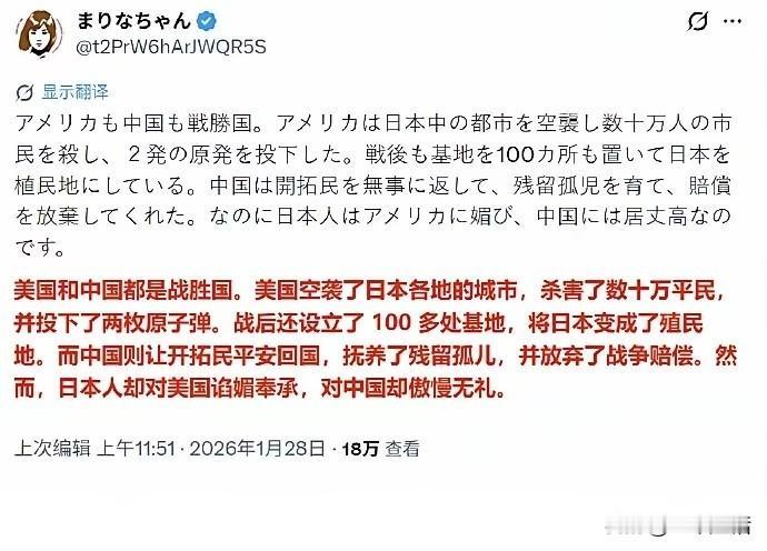 这条推文在海外社交媒体上爆火了,直接揭露了日本人精神上的“软骨病”!这展示了日本人的双面性: 在对待美国的态度上,美国用2枚原子弹杀害了日本数十万平民,战后更是把日本管得死死的,修建了军事基地,从军事和经济上套牢了。日本对美是鞠躬点头、谄媚奉迎。 在对待中国的态度上,日本二战侵华给中国造成巨大损失,中国放弃巨额战争赔偿、善待日本遗孤,即使日本拜靖国神社、篡改历史、叫嚣台海…中国还愿意去督促日本改过、认错,以最大的善意去对待日本。但日本却忘恩负义,选择性遗忘,一步步得寸进尺。 这种“软骨病”,是对强者的依赖和对恩人的背叛!这种行为是记吃不记打,对它好的受伤害最深,对他强硬的的反而得到它的讨好。所以,有时我们也可以采取一系列强硬的态度和措施,不是吗?