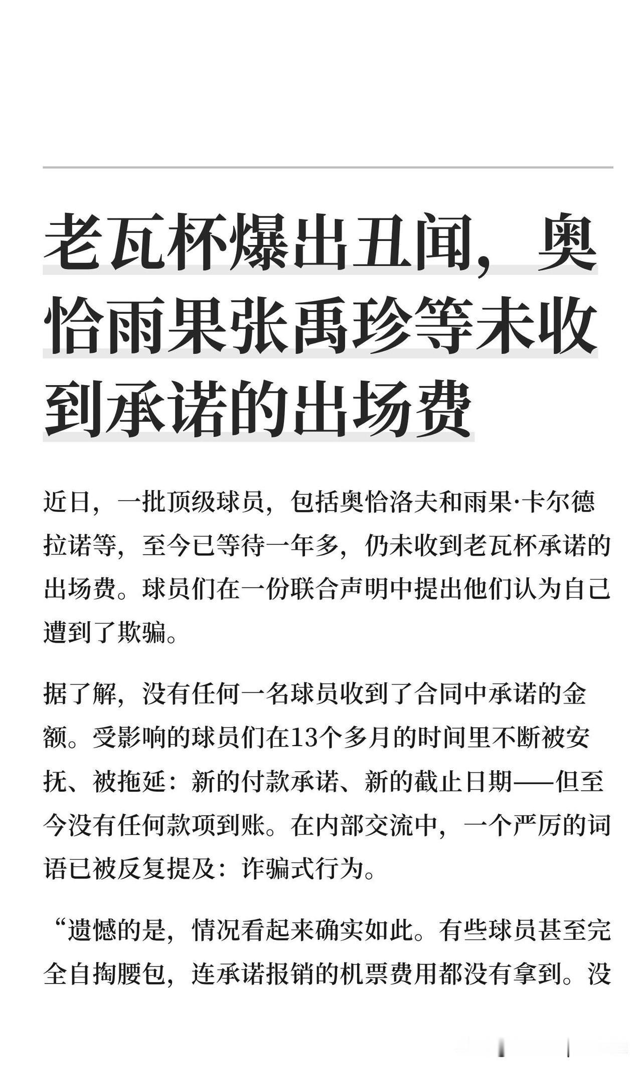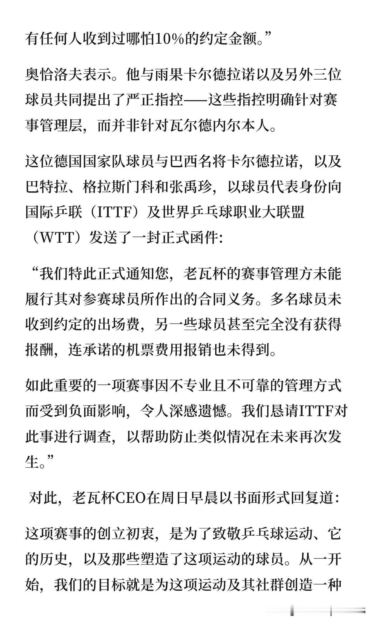 老瓦杯被爆拖欠球员出场费,其中包括马龙,陈梦等。 现在奥恰洛夫,雨果,巴特拉,格拉斯门科,张禹珍等提出了严正指控。 前段时间,有报道老瓦要出来打J级联赛,应该与这个也有关系。 这是24年老瓦杯的事情,25年一开始说要举办,但是一直没有消息, 如果有拖欠,那肯定也是组织不到球员的。