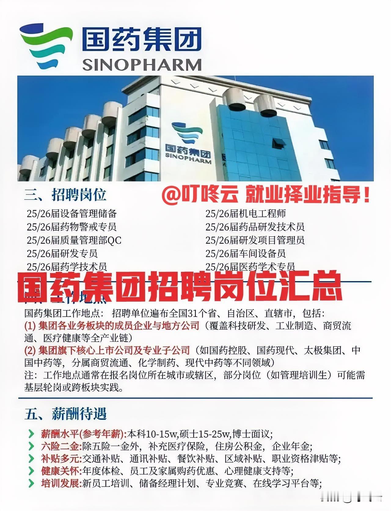 招聘好岗!国药集团26年招聘岗位要求及薪资待遇汇总揭秘!公司发展前景广阔,岗位非常多,年薪10~25万!全国各省市可选,薪资福利待遇非常优越!速速围观揭秘详细内容![点亮平安灯][点亮平安灯][烟花][烟花] 欢迎关注@叮咚云 将优先为粉丝职业规划指导,为你定制最适合的就业择业方案!欢迎留言交流讨论。[来看我][来看我] 免责声明:图片来自网络,仅供参考! 央国企招聘国企招聘医药企业薪酬