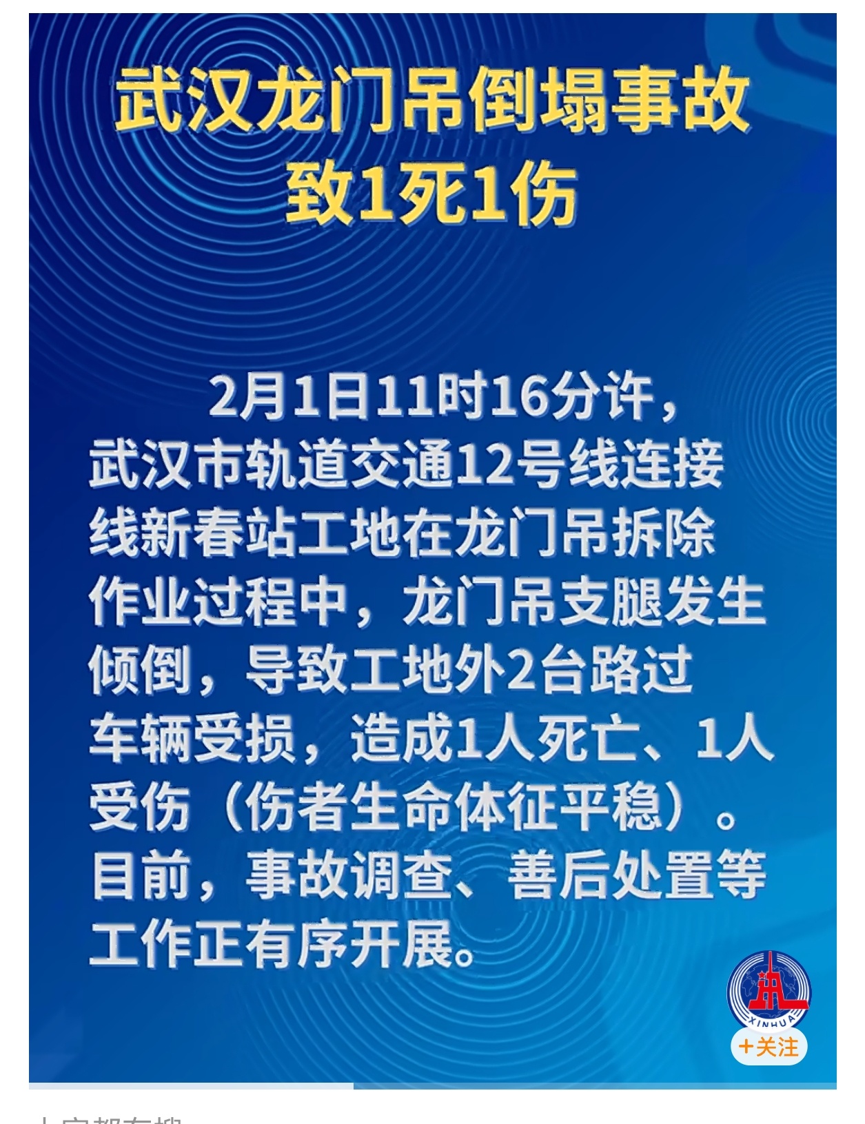 武汉龙门吊倒塌事故致1死1伤一人死亡,一人受伤,两台车辆受损;这也属于严重的安全生产事故,每次工作的时候都不上心,一旦出事故一直想着弥补,想着解决。从根本做起,多整顿一下安全生产意识吧。