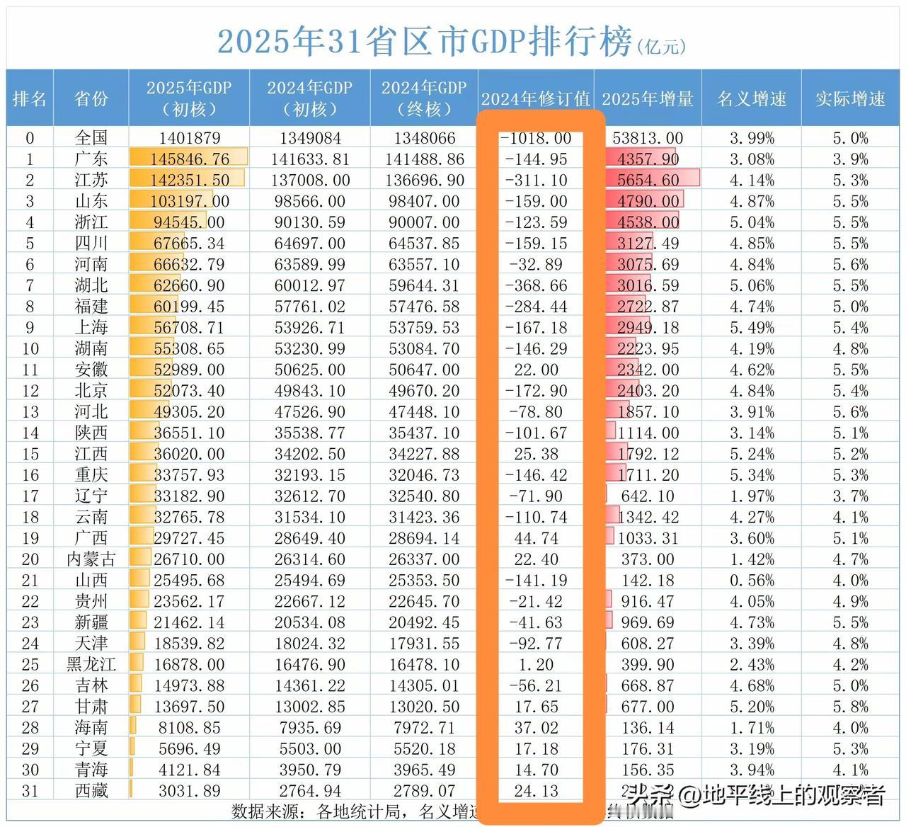 安徽:GDP洪流中少有的冷静者 2025年省域GDP排位战已经尘埃落定。在近十天时间内,31个省份陆续亮相,31张成绩单汇总后,一张崭新的排名表展现在我们面前。 我对这样的数据原本兴趣不太高,因为我知道,这只是各省GDP速报后的一个初核结果。初核后,国家统计局需要结合财税收入、工资报酬、会计报表等关键指标对各省的GDP数据进行精打细算,最后的结果也就是所谓的终核。相较于现在的这个初核数据,一年后公布的终核数据才是经过精雕细刻的数据,更贴近现实,更具含金量。 说到终核,不由得让我对这份表格中的2024年GDP修正数据(红色方框中)有着特别的兴趣。 2024年,全国GDP的终核较初核调减了1018亿元,其中,21个省份调减,仅10个省份调增。最特别的是,调减的省份均位于前半段,调增的省份集中于后半段,唯有安徽是个例外。在GDP十强省份无一例外的调减下,排第十一位的安徽却调增22亿。安徽如一块巨石矗立在滚滚而下的洪流中,激起一片片水花。 安徽这样的逆流,是一种偶然吗?非也。早在2018年的第四次全国经济普查中,并非经济大省的安徽GDP被国家一次性调增4千多亿元,增量排名31个省份之首,令人震惊。这样的一种结果,也暗示着安徽的GDP长期被低估了。在这个普遍GDP冲动的大环境里,安徽却被低估了,原因又在哪里呢?中国人普遍有着不显财不露富的习惯,这种习惯在安徽可能尤其明显。当那些企业主或个体经营者在面对统计调查时,可能普遍给出了保守的数据,这种情况在第三产业统计中可能表现得最为突出。