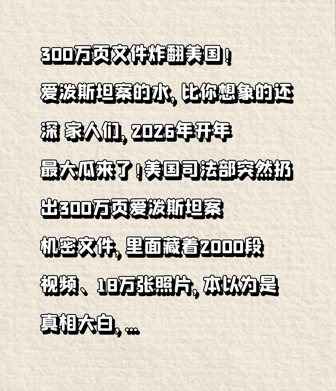 300万页文件炸翻美国!爱泼斯坦案的水,比你想象的还深 家人们,2026年开年最大瓜来了!美国司法部突然扔出300万页爱泼斯坦案机密文件,里面藏着2000段视频、18万张照片,本以为是真相大白,结果越看越毛骨悚然——这哪是披露案情,分明是撕开了美国权贵的遮羞布! 谁还记得2019年那个“自杀”的亿万富翁?官方说他在狱中自缢,可监控偏巧“坏了”,狱警8小时不巡查还伪造记录。当时大家都猜有猫腻,但没实锤。直到这次文件曝光,才发现水有多浑:他死前两天急着立遗嘱,把2.88亿财产转给44个人,连“萝莉岛”都给了女友,转头就“自杀”了?更离谱的是,心理评估说他自杀风险“极低”,坚决否认想寻短见,这反转比电视剧还荒诞。 本以为新文件能揭开真相,没想到是大型“涂黑现场”!550页文件直接变成黑纸,119页大陪审团记录全被挡死,连特朗普和爱泼斯坦的合影,公布不到24小时就被偷偷删除。更讽刺的是,法案要求全公开,司法部却选择性爆料,骂民主党就放克林顿的飞行日志,提共和党就打马赛克,合着受害者的痛苦,只是两党互撕的工具? 最让人心寒的是那些未成年受害者。14岁被胁迫,15岁遭性侵,她们等了十几年正义,却看着加害者靠秘密协议只坐13个月牢,看着关键证据莫名消失,看着涉案的前总统、王子们全身而退。更让人揪心的是,核心证人朱弗雷去年自杀身亡,她到死都没等到一句道歉。 现在1.2万份文件只是冰山一角,还有数百万页藏着多少秘密?是真自杀还是被封口?那些被涂黑的名字背后,还有多少未被揭露的罪恶?法律本应是弱者的保护伞,可在财富和权力面前,却成了权贵的挡箭牌。 屏幕前的你觉得真相还能大白吗?欢迎在评论区留下你的看法,点赞转发,让更多人关注这场迟到的正义。我们等的不是八卦,是每个受害者都能被公平对待,是法律面前真的人人平等!