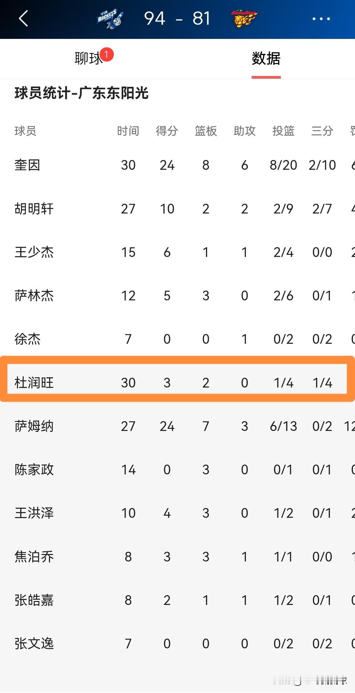 广东东阳光神射手杜润旺真是太反常了!在今天广东东阳光客场以81:94不敌宁波町渥的比赛中,贵为神射手的杜润旺却一反常态手感冰凉,他在替补出战的30分钟里,三分球4中1非常低效的得到3分,他的场上正负值为-3。 老实说,如果杜润旺无法在三分线外为球队提供充足的火力的话,那么他在场上的作用就会变成负的,因为他的防守能力比进攻能力更差。