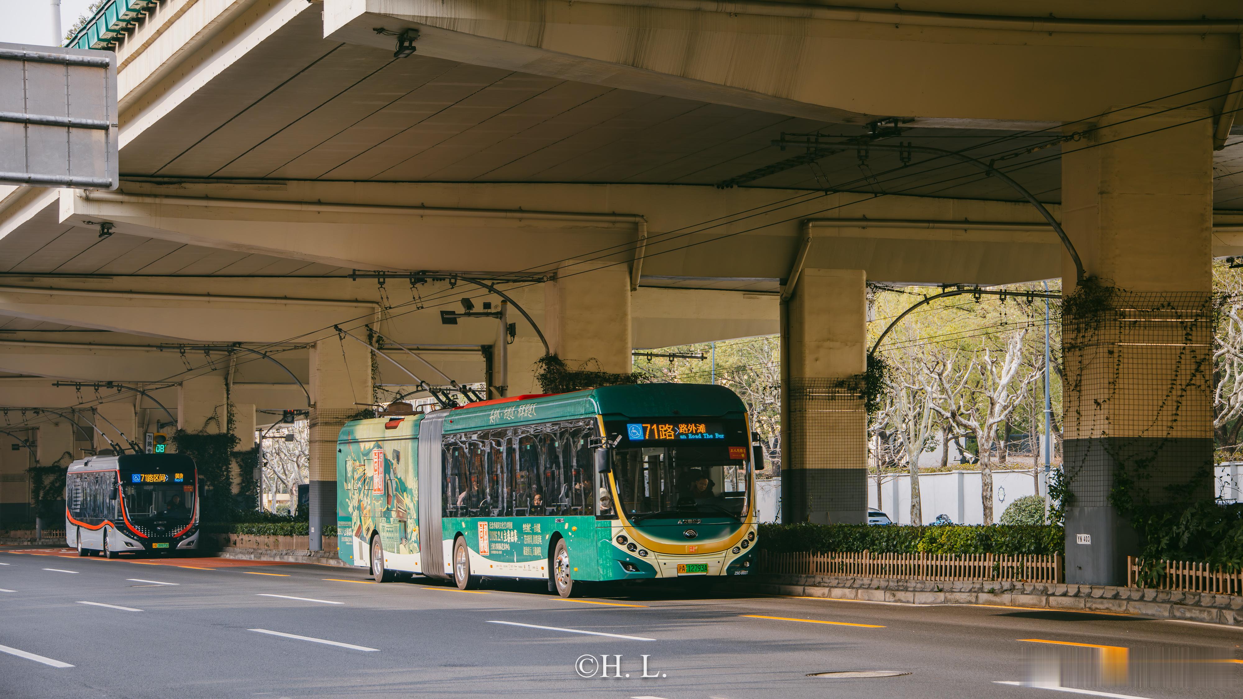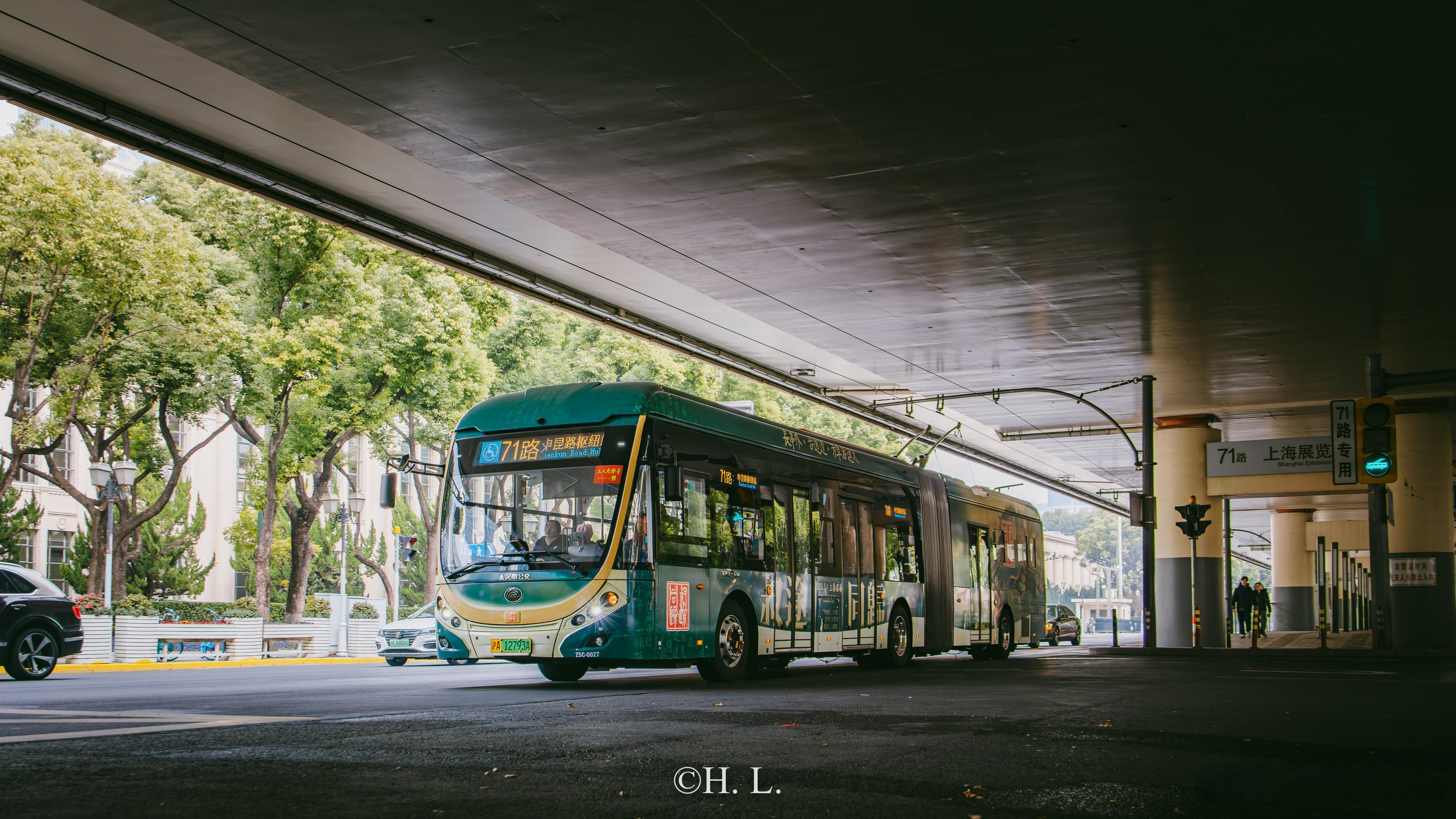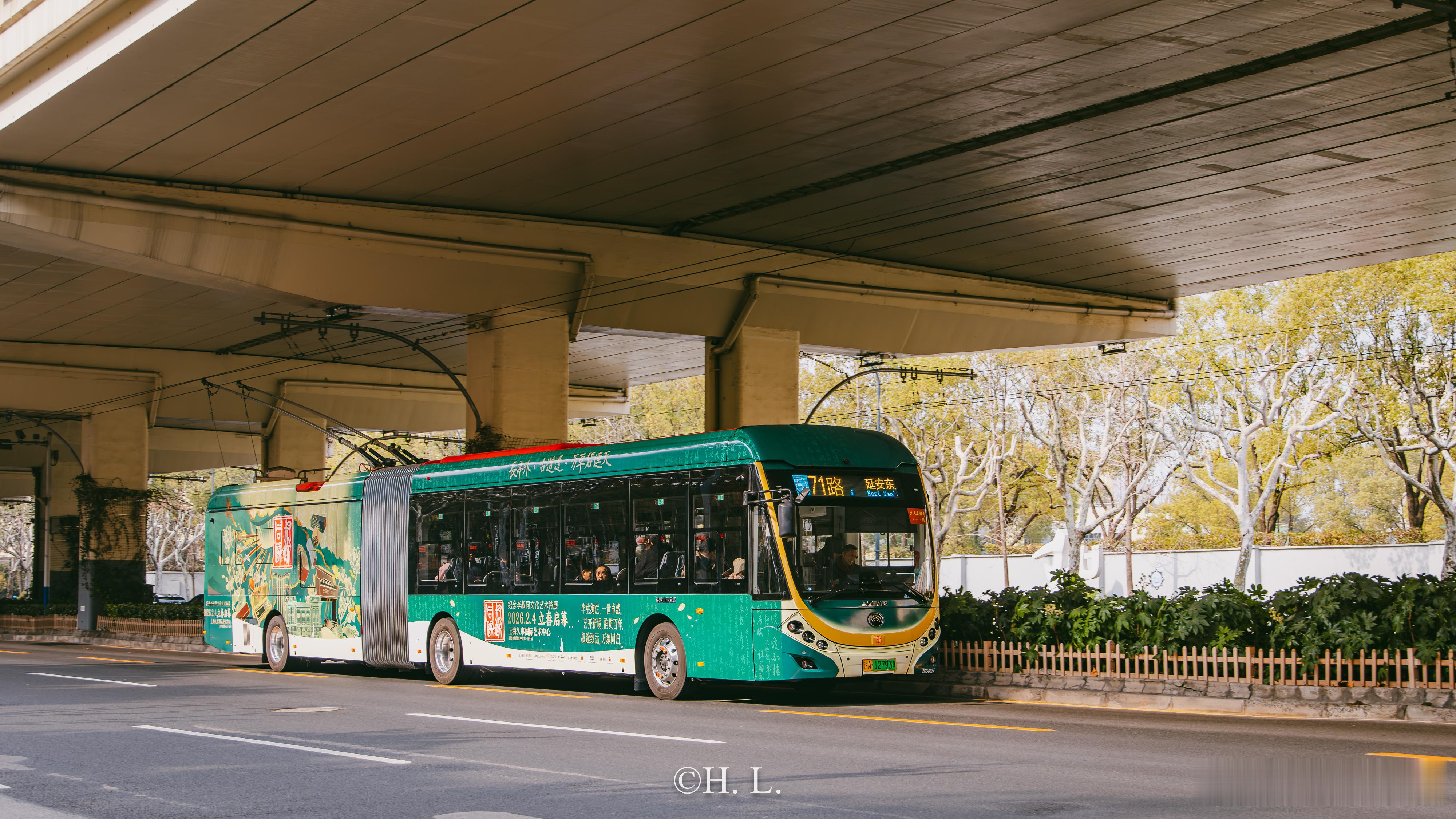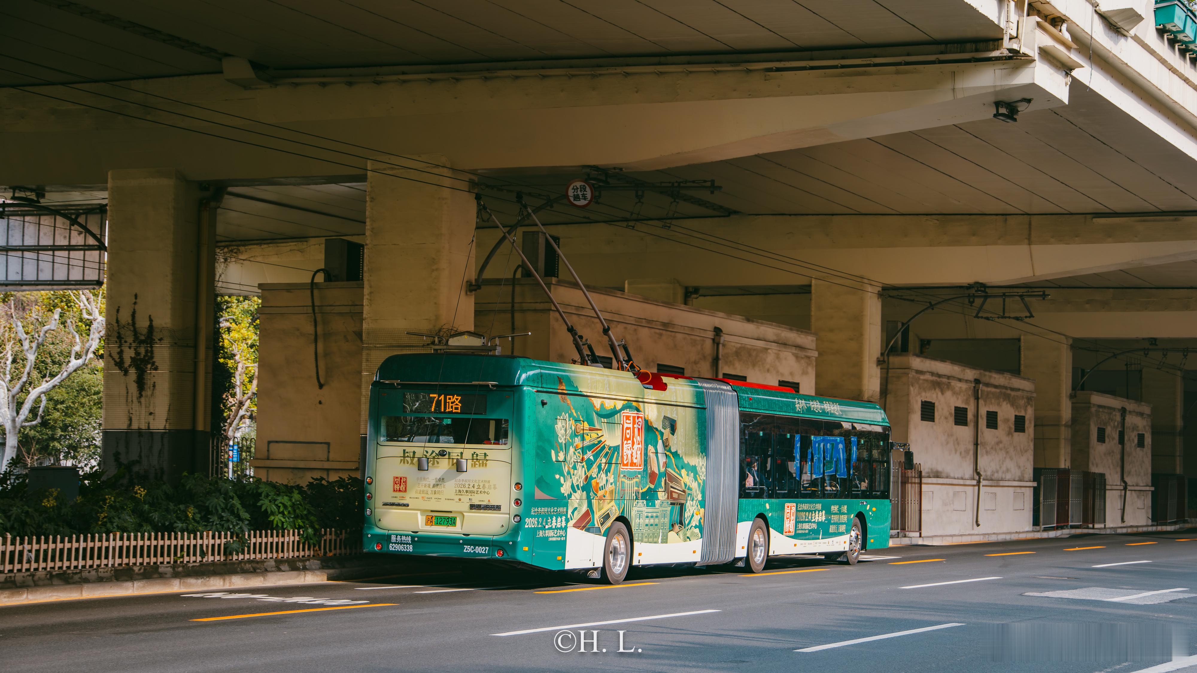 71路无轨电车Z5C-0027,新增李叔同展的全身广告。该广告以绿色为底色,包覆率高,设计很漂亮。李叔同(弘一法师)的作品值得一看。