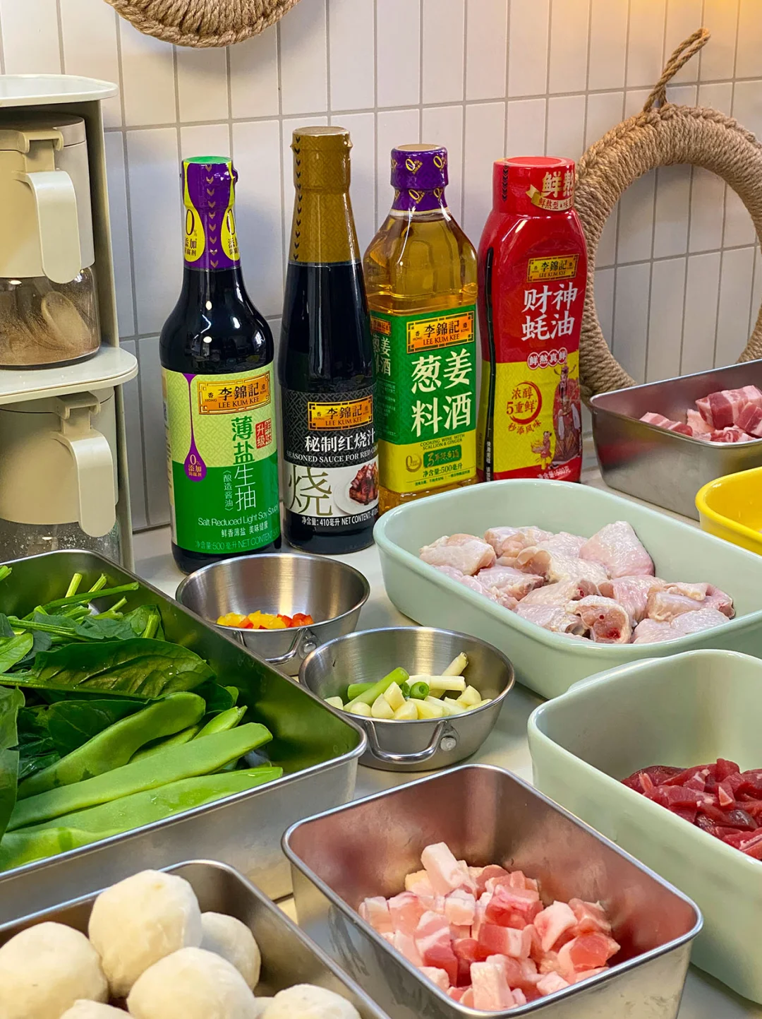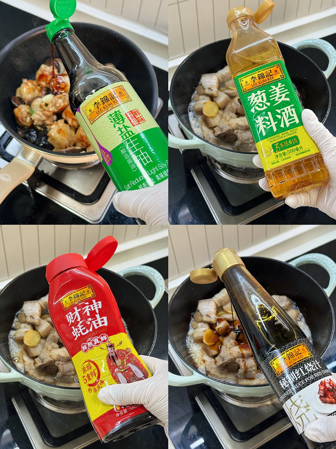 再搭配李锦记秘制红烧汁一步就能上色增香,省去复杂调配;葱姜料酒去腥温和,还能留住食材原香,这一套组合承包年夜饭调味!