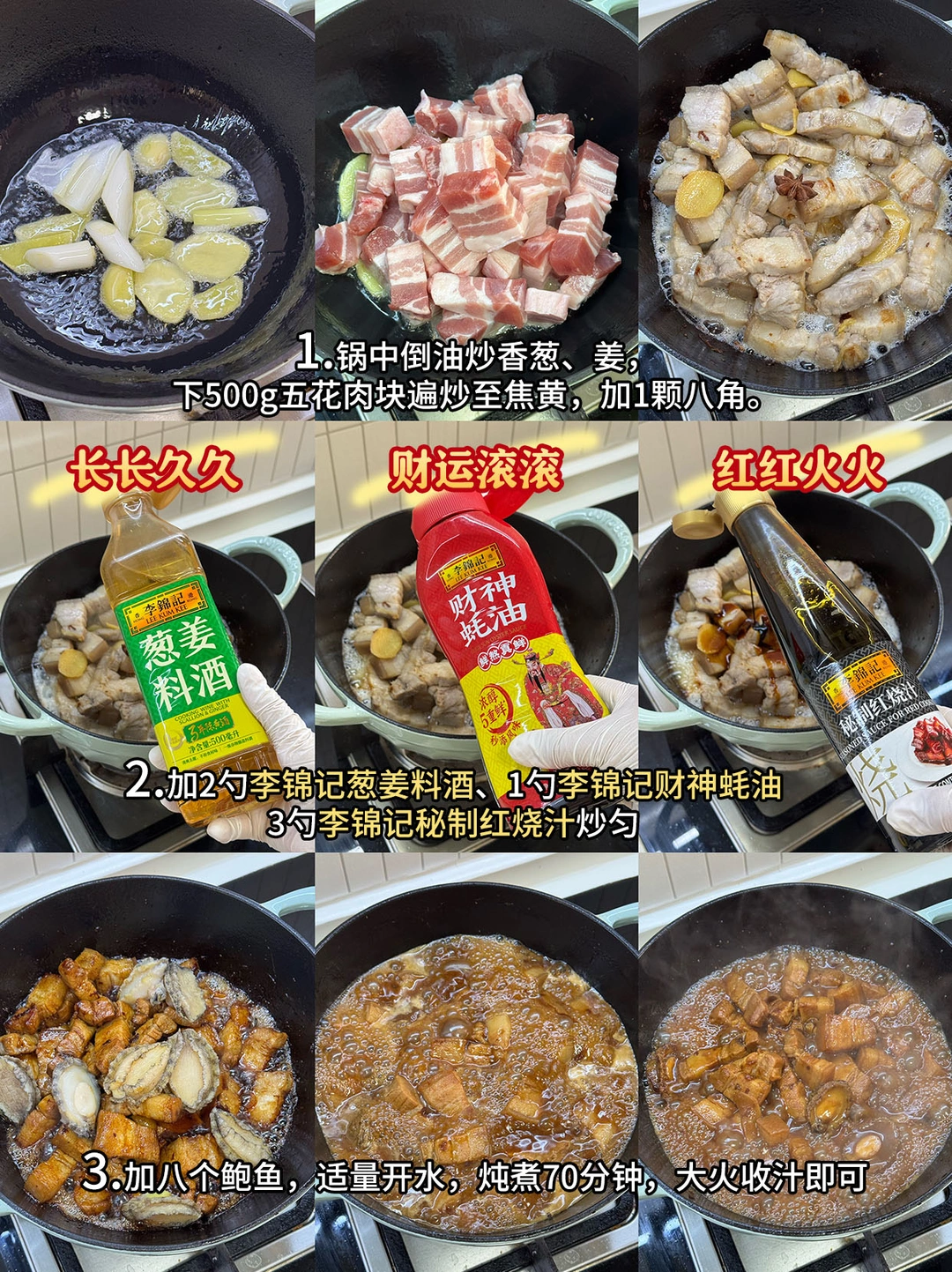 好吃的秘诀,全在李锦记财神蚝油,鲜蚝鲜熬而制,直接给菜品拉满多重鲜味。❤️红烧肉的咸鲜、焦鲜层层迸发,鲍鱼的甜鲜、海鲜、醇鲜也被完美激发,鲜到骨子里~