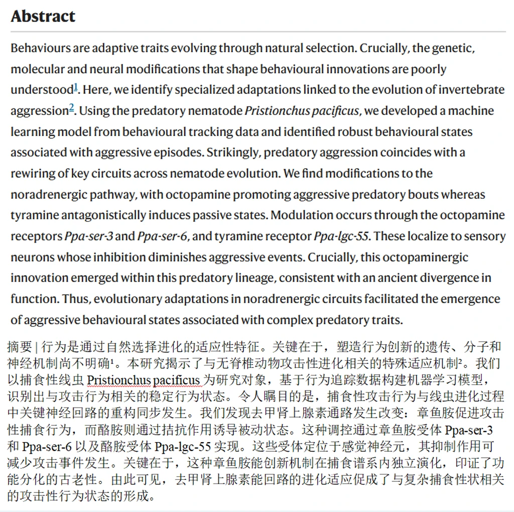 在自然界,攻击性是生存的关键。线虫捕食时,章鱼胺(去甲肾上腺素的“远古亲戚”)通过Ppa-ser-3受体激活攻击行为,而酪胺(类似去甲肾上腺素前体)通过Ppa-lgc-55受体抑制攻击,形成动态平衡。