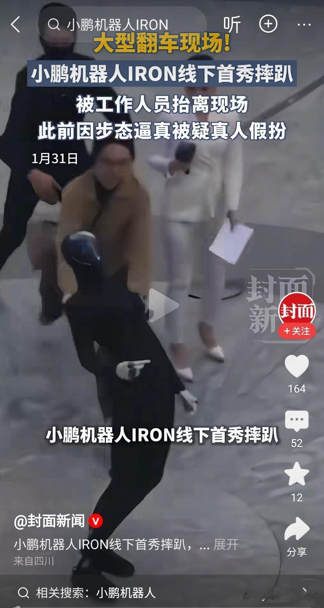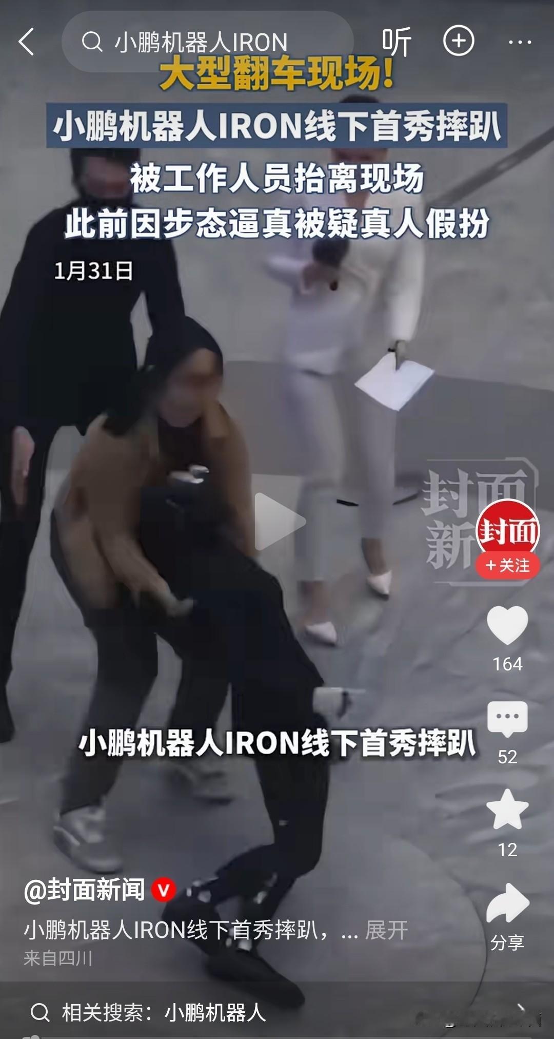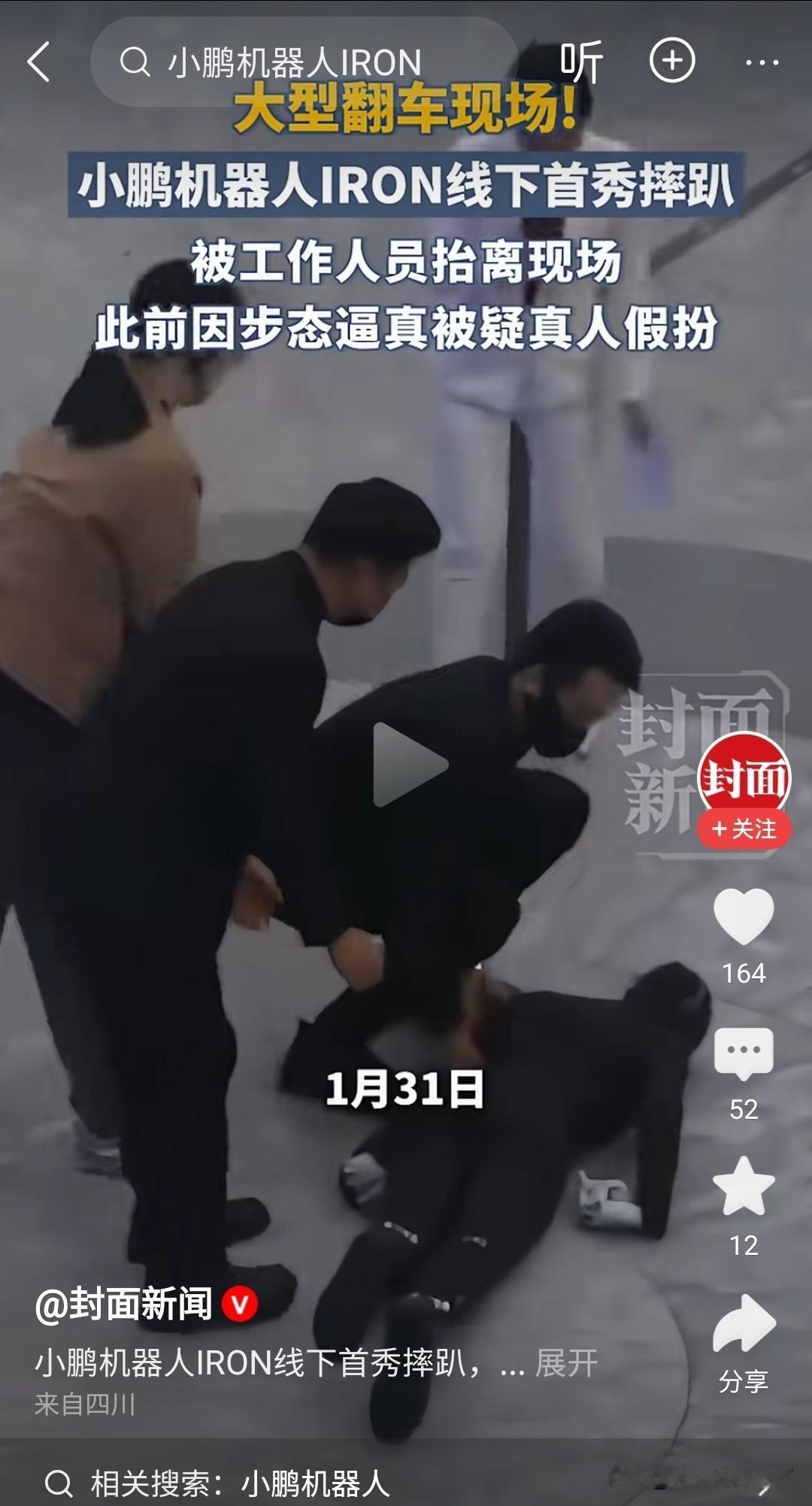和发布会上的机器人相比,小鹏机器人的线下首秀可以用惨不忍睹来形容。 首先走起路来有明显的卡顿,再就是突然失控,倒地不起。用一个成语来形容就是“徒有其表”。 一种新事物的出现,会经常伴随着失败。中国人形机器人的发展之路也是如此。但这个领域属于专业性非常高的领域,建议还是交给专业的公司去做吧。 造车还没造明白,就不要一心二用,去造机器人了。