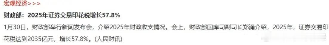 就在刚才,我看到了一条消息:2025年,证券交易印花税达到2035亿元,增长57.8%。那么证券印花税的大幅增长,是不是利好证券板块呢?我觉得至少从去年的角度来看,应该是可以这么理解的。