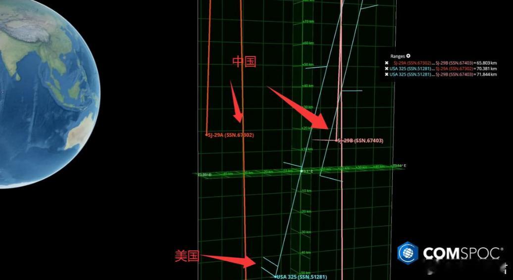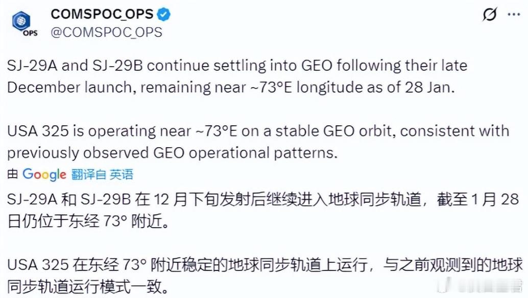 从美国这一次公布的说明情况来看,指出了我国卫星的精确位置,也可以从说明之中看到,是从未停止过监控,其指出了:SJ-29A 和 SJ-29B 在 12 月下旬发射后继续进入地球同步轨道,截至 1 月 28 日仍位于东经 73° 附近,USA 325 在东经 73° 附近稳定的地球同步轨道上运行,与之前观测到的地球同步轨道运行模式一致。看到了吧?这数据的确是比较精确了。相当说,我国的这两颗卫星一直在美国的侦察卫星USA 325之下进行监控,完全都没有离开,只要我国卫星走动,它们的卫星也要跟随而来,这就是关键性的问题。