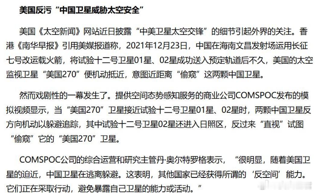 美国监控中国卫星要干什么,有何目的?我国卫星有什么用处?其实,这可能是美国最为担心的,就是中国实践卫星会在太空之中展示出什么“逆天技术”,因为在此前我国进行实践卫星测试的时候,就出现了这样的一幕,那就是在2021年7月,“美国 271” 号卫星偷偷靠近和伴飞中国实践- 20号卫星,结果中国卫星出现了反向机动,避开美国的卫星机动,过后,又发现了中国实践卫星出现了演变“太空拖船”的一幕,将报废的卫星拖入到了报废轨道上进行销毁。