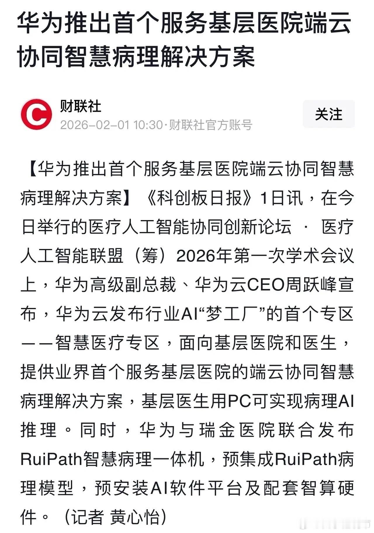 华为放大招!大医院垄断要终结?华为把AI塞进村诊所!今天,华为云在2026医疗AI大会引爆全场:智慧医疗专区上线 + 全球首发RuiPath智慧病理一体机!最震撼的不是技术多高深,而是——乡镇医生用一台老旧PC,就能跑顶级癌症AI诊断。切片上传,3秒出结果!肿瘤识别、病理分型、分级判断……精准度碾压新手医生。以前只有北京上海三甲医院才有的AI病理能力,如今县城卫生院、乡村诊所也能开箱即用。这哪是升级?这是中国医疗的平权革命!华为不造药、不开医院,却用端云协同+国产算力,把瑞金医院的顶尖AI模型直接塞进基层诊室。没有服务器?没关系!旧电脑就行。不懂代码?点一下就行。华为正在用AI,打通了医疗最后一公里!投资主线已清晰:医疗信息化:卫宁**、创业**;国产智算+医疗设备:东软**、万东**;病理服务生态:迪安**、金域**。风口已至,机会就在眼前!