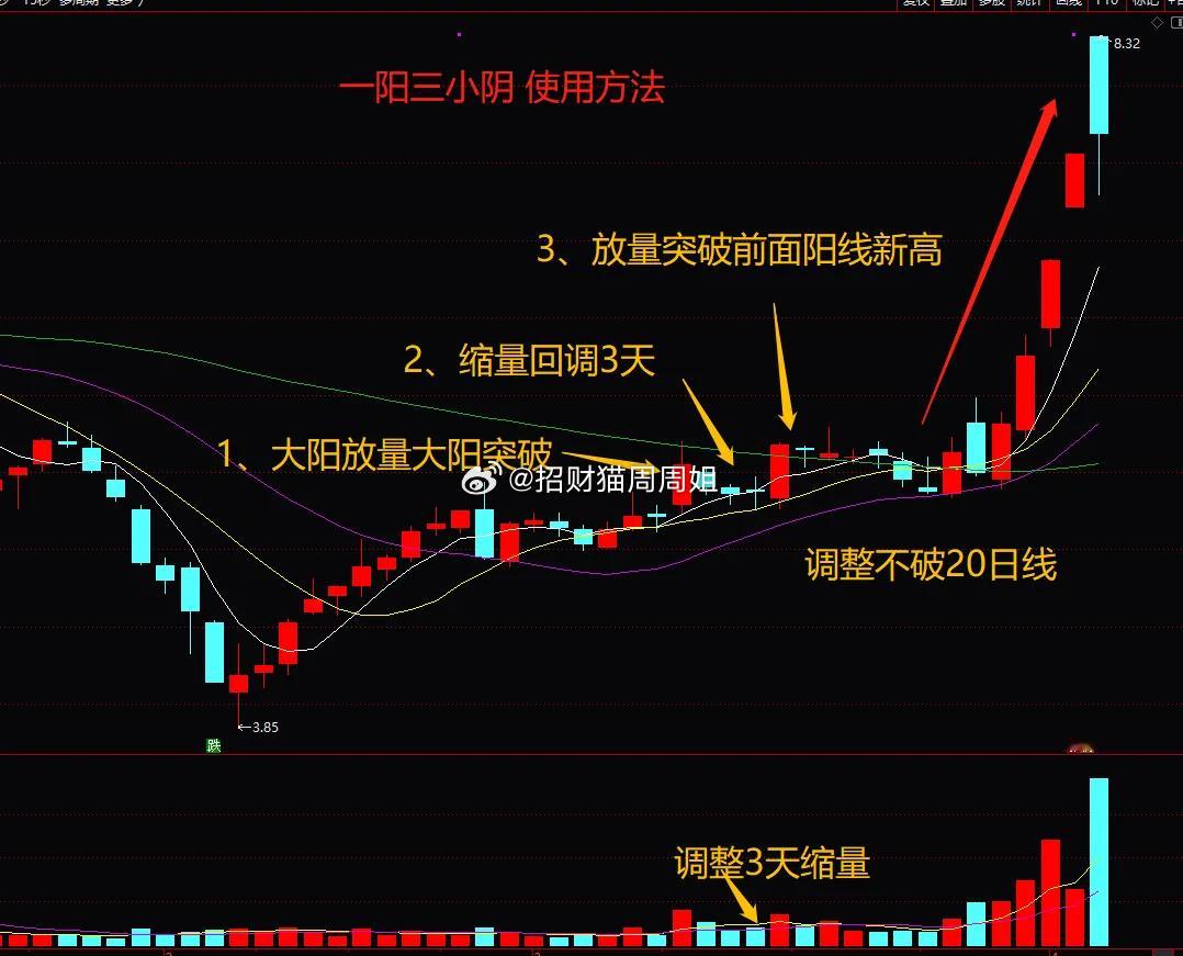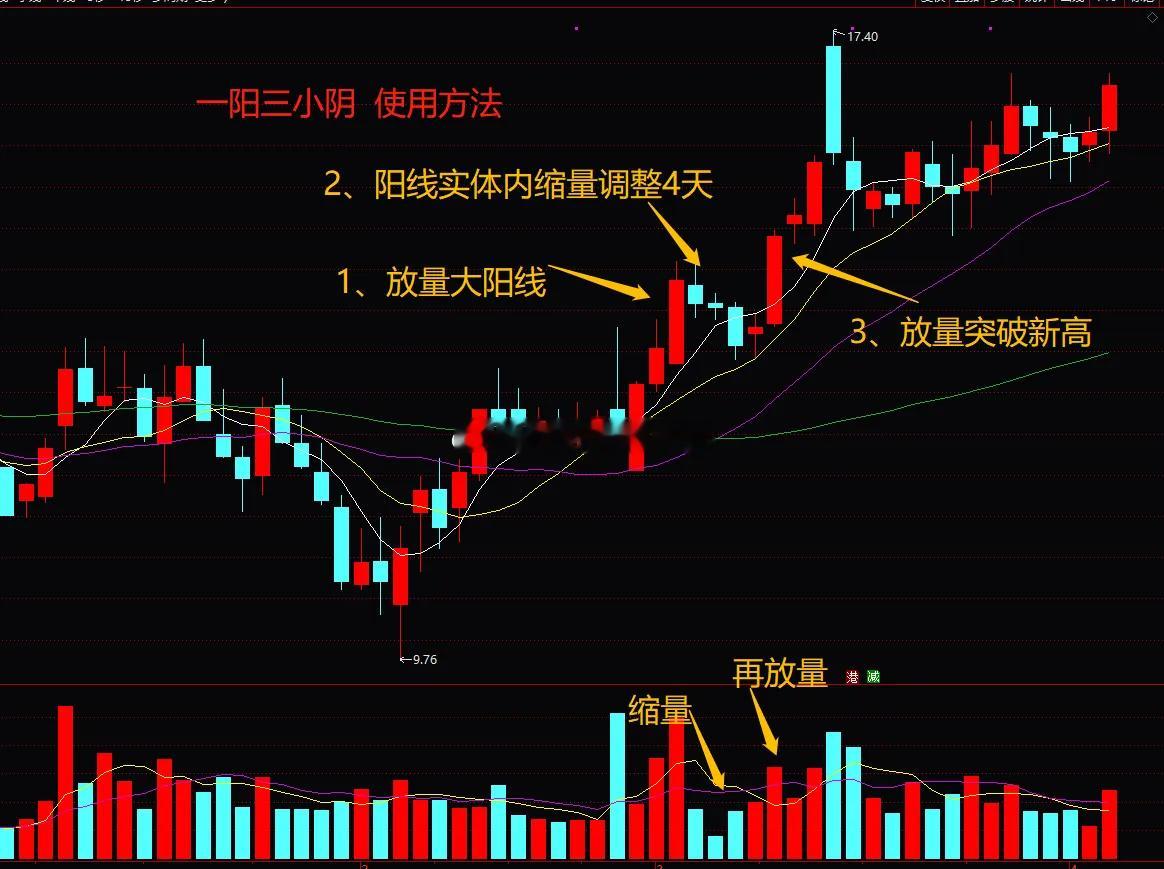 先来认识“一阳三小阴”结构是啥样,简单来说它是由一根大阳线之后,紧接着是出现3根小阴线,而且成交了出现收缩,随后出现一根放量的阳线,把这三根小阴线吃掉,并突破第一根阳线的高点,有点类似于小N字结构。