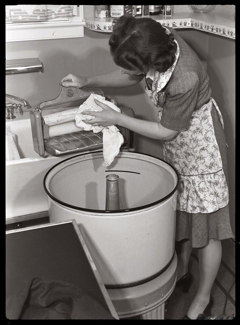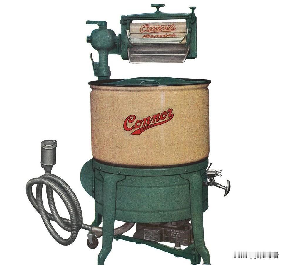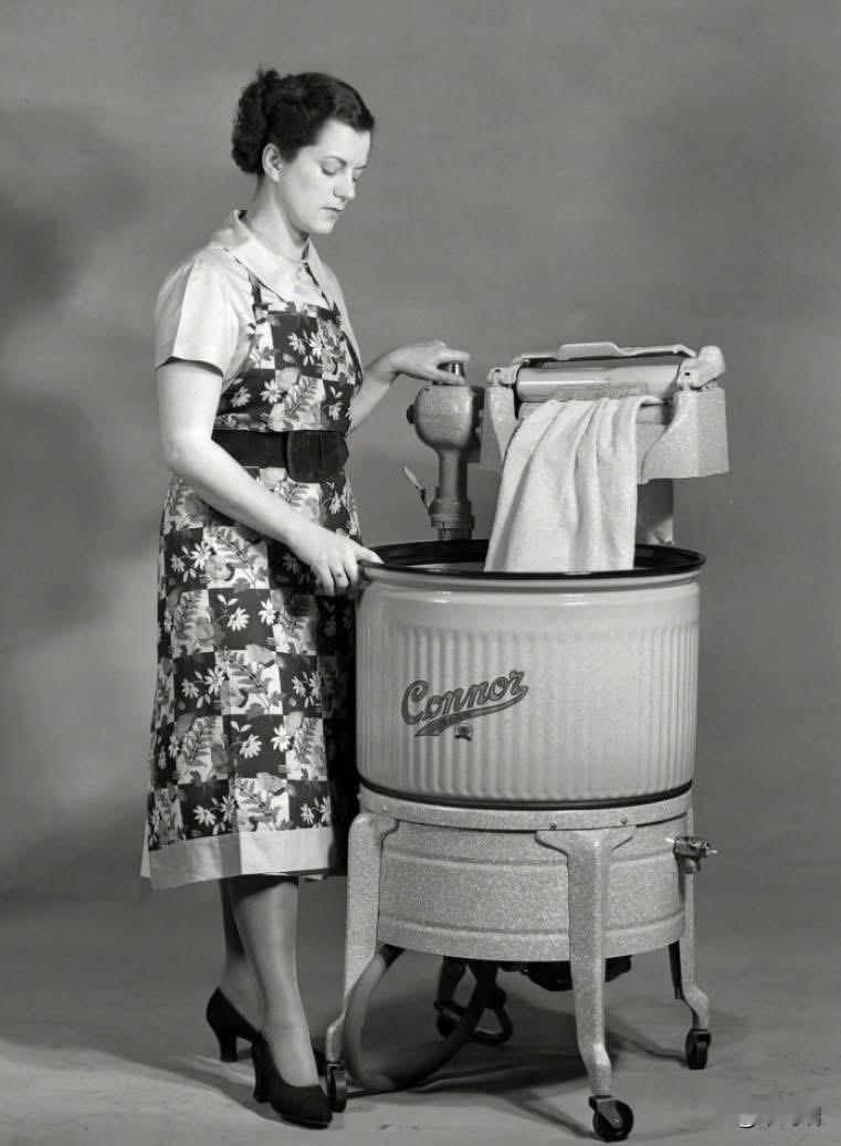 这张图片展示了一位女士正在使用一台 Connor牌绞干式洗衣机。这种洗衣机在 20 世纪中叶的家庭中很常见,尤其是在 1950 年代,它大大减轻了手工洗衣的劳动强度。 关于绞干式洗衣机 功能: 这种机器有一个洗涤桶和一个电动或手动绞干器(顶部的一对滚筒)。衣物在洗涤桶中用搅拌器清洗后,需要手动放入滚筒之间,挤出多余的水分。 绞干式洗衣机是现代全自动洗衣机出现之前的重要过渡技术。J.H. Connor & Son Limited 公司自 19 世纪末就开始生产这种机器。 操作与安全: 使用这种洗衣机需要操作者持续看管和小心,因为手或衣物可能会被滚筒卡住,造成人身伤害。