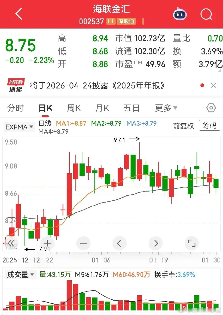 海联金汇业绩稳增基本面无虞,横盘期三次探底生命线均快速收回,未破位但偏磨人,守得住支撑则企稳,破位需果断离场。