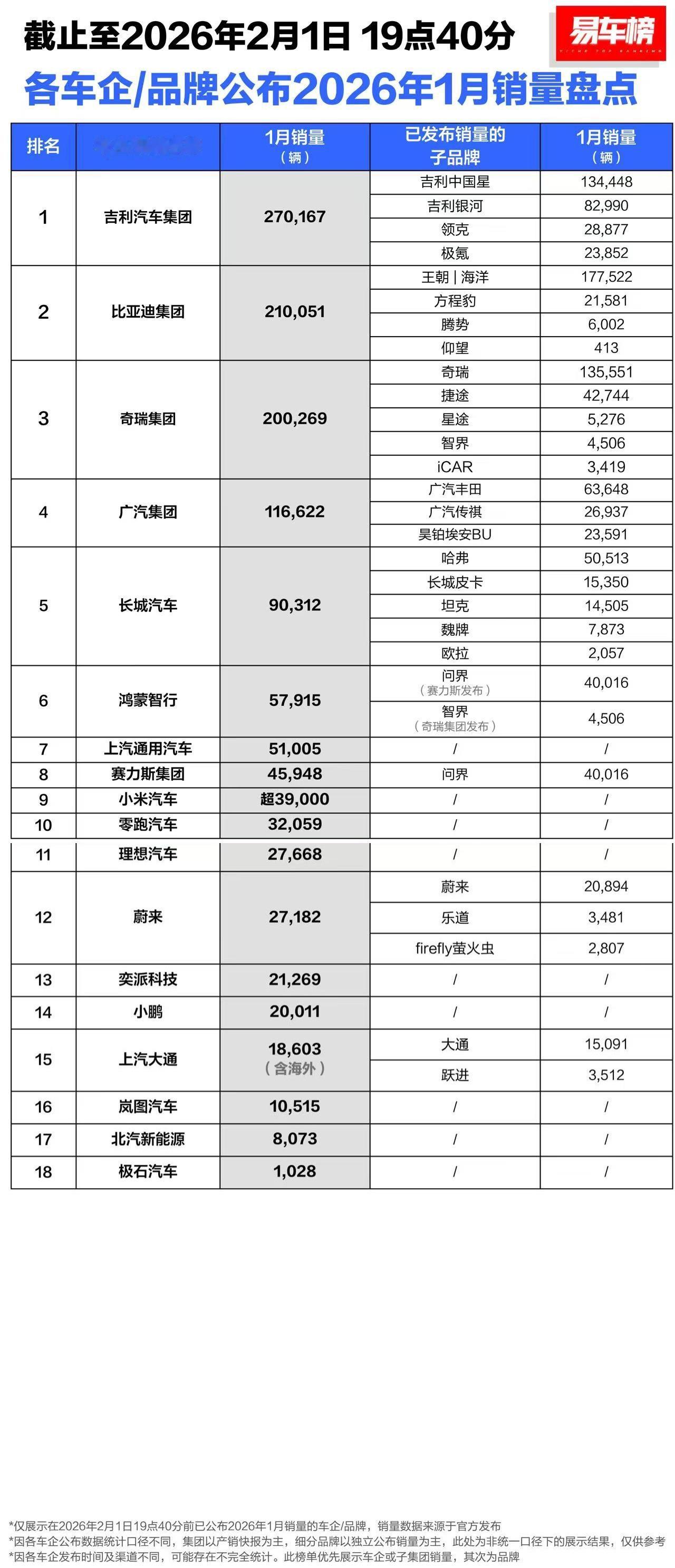 易车统计的各车企/品牌公布2026年1月销量盘点。